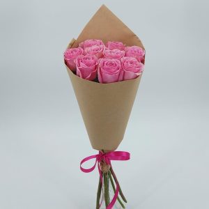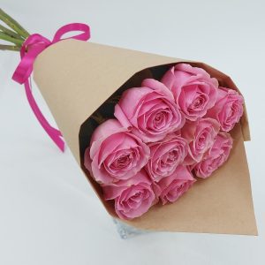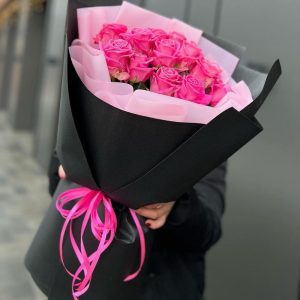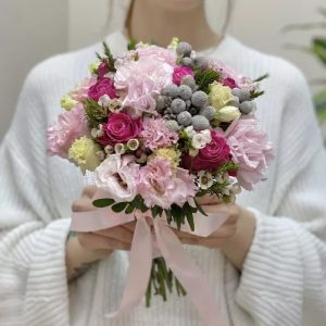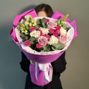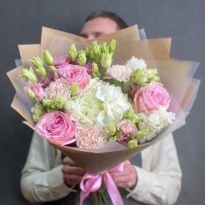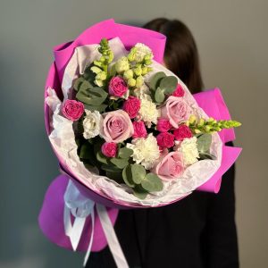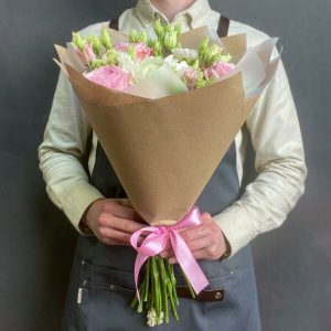 Buchet Cu Flori Mixt Din Trandafiri Roz Eustome Albe Si Hipericum Roz