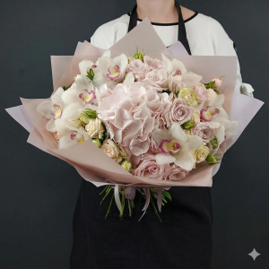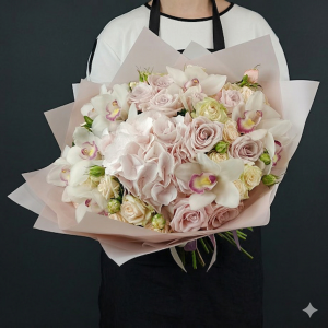 Buchet Mixt „Eleganță Regală” – Orhidee Cymbidium, Hortensie și Trandafiri