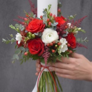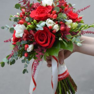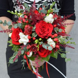 Buchet de Mireasă sau Nașă „Passion & Elegance” – Trandafiri Roșii și Frezii Albe