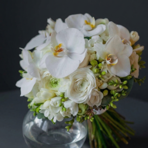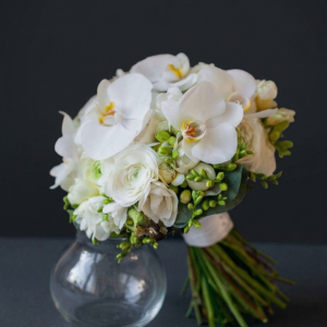 Buchet de mireasă elegant din Frezii și Orhidee Phalaenopsis