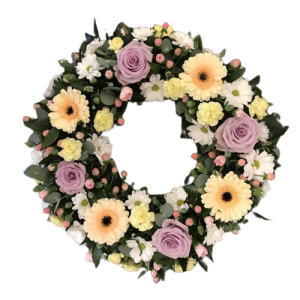 Coroana Funerara In Nuante De Rosu Din Trandafiri Garoafe Si Gerbere