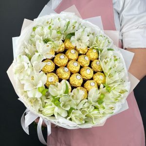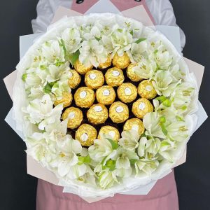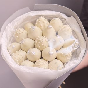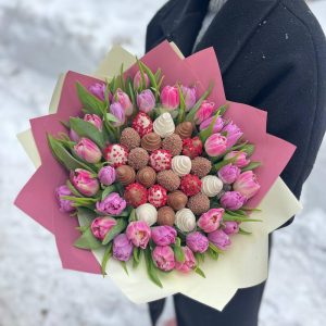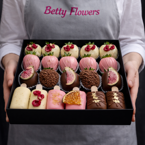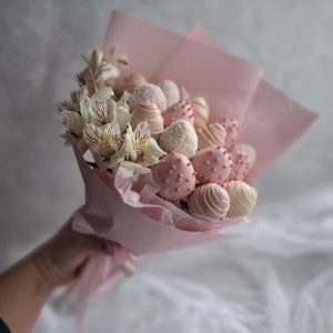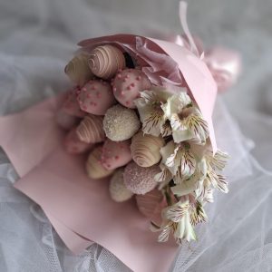 Aranjament Premium Cu Căpșuni Bicolore Alb-Roz Si Flori Naturale
