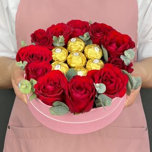 Cutia Love & Gold – Aranjament cu Trandafiri Roșii și Ferrero Rocher