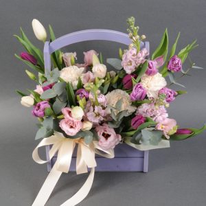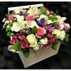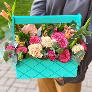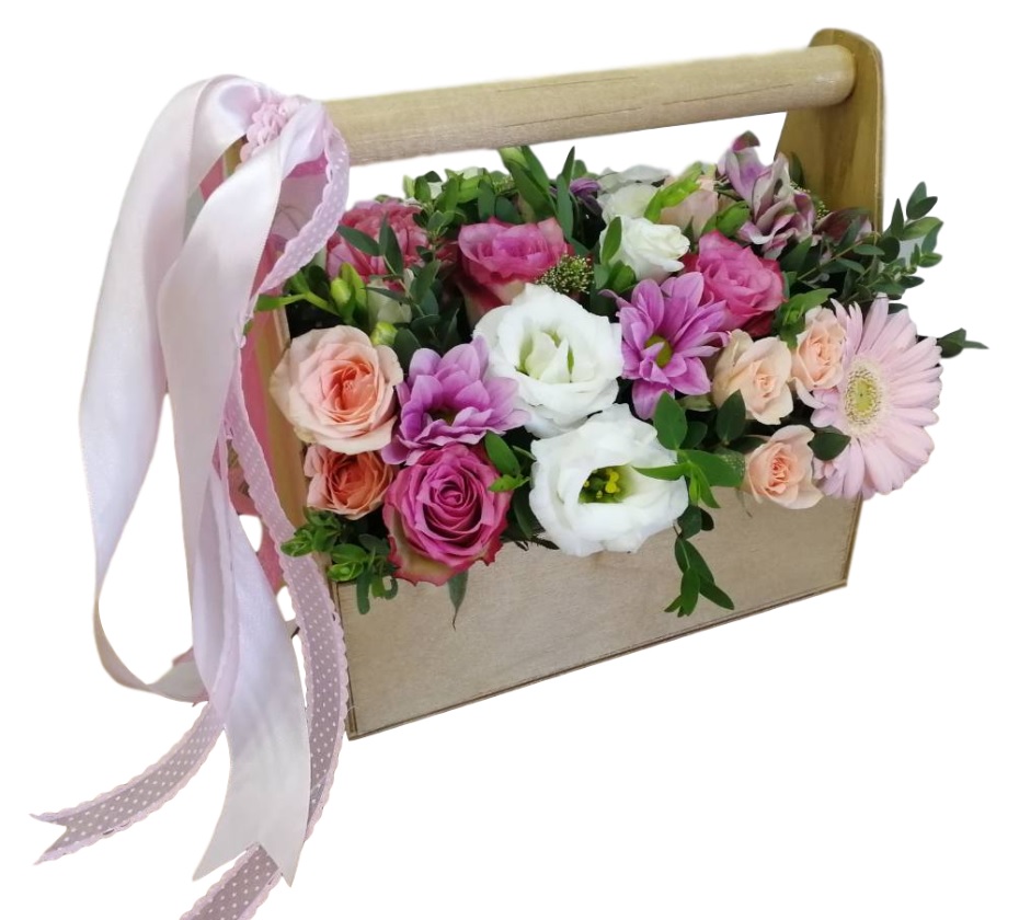 Un aranjament floral delicat în lădiță din lemn, realizat din flori în nuanțe elegante de roz și alb. Trandafirii, lisianthusul și margaretele se îmbină armonios pentru a crea un aranjament romantic și rafinat, iar gerbera roz pal adaugă un accent luminos și vesel.