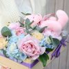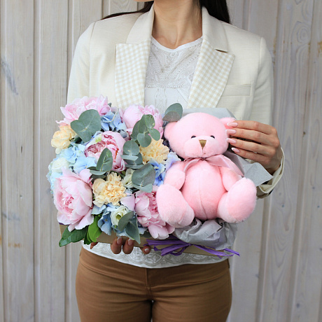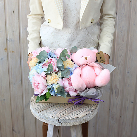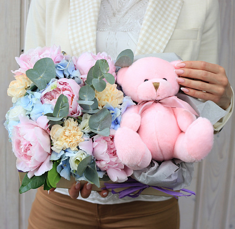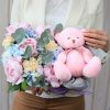 Culorile pastelate și textura bogată a florilor se completează perfect, iar ursulețul de pluș adaugă o notă caldă și afectuoasă. Un cadou ideal pentru momente speciale, aniversări sau gesturi atent alese