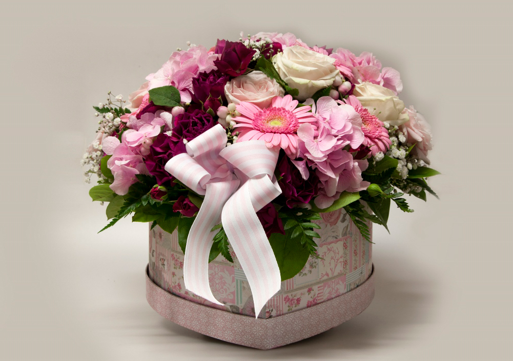 Aranjament cu hortensie si trandafiri gerbera, mine rose,in cutie.