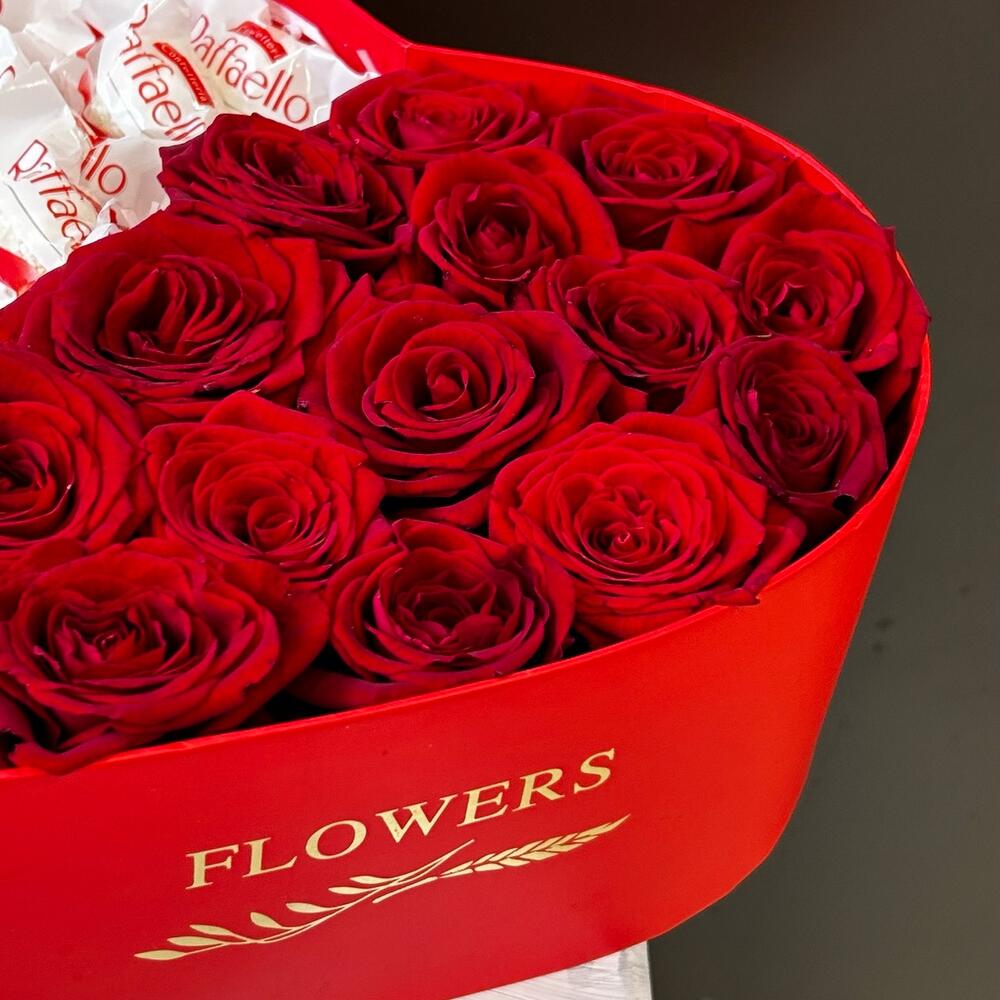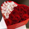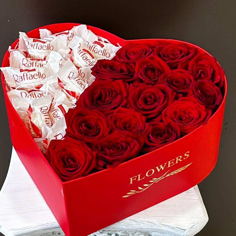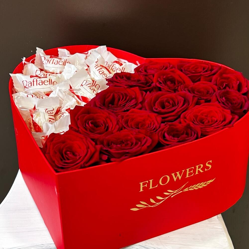 Încântați-vă persoana iubită cu un cadou deosebit: Aranjamentul Floral cu 15 trandafiri roșii și 150 g de Raffaello! Acest aranjament elegant este prezentat într-o cutie în formă de inimă, simbolizând dragostea și afecțiunea pe care doriți să le transmiteți.