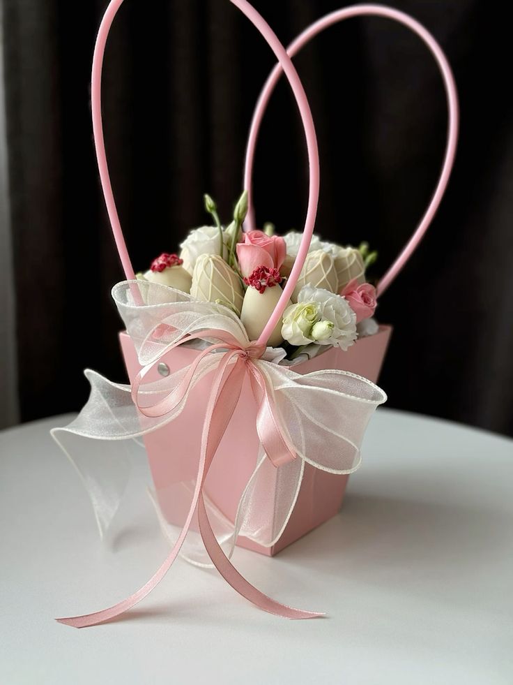 Realizat cu atenție la detalii, aranjamentul este prezentat într-o cutie tip pungă roz, modernă și feminină, ce oferă un aspect premium și sofisticat.