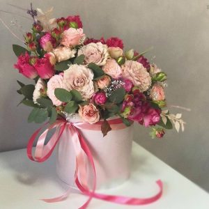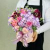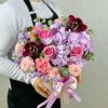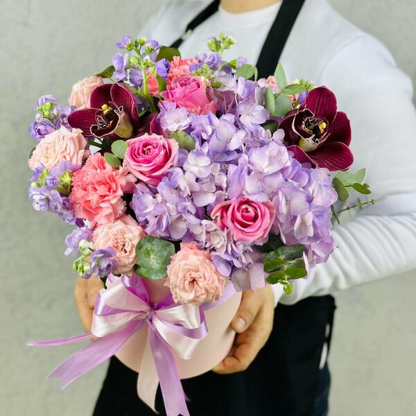 Încântă-ți simțurile cu acest aranjament floral elegant, creat cu o selecție superbă de flori în nuanțe de mov și roz, prezentat într-o cutie rotundă sofisticată. Perfect pentru a adăuga un strop de frumusețe oricărei încăperi, acest aranjament este ideal pentru ocazii speciale sau pur și simplu pentru a răsfăța pe cineva drag.