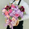 Comandă acum acest aranjament floral cu flori mixte în nuanțe de mov și roz și aduce un strop de frumusețe și eleganță în viața ta sau în viața celor dragi! Fiecare detaliu contează, iar acest aranjament va aduce zâmbete și fericire oriunde este așezat.