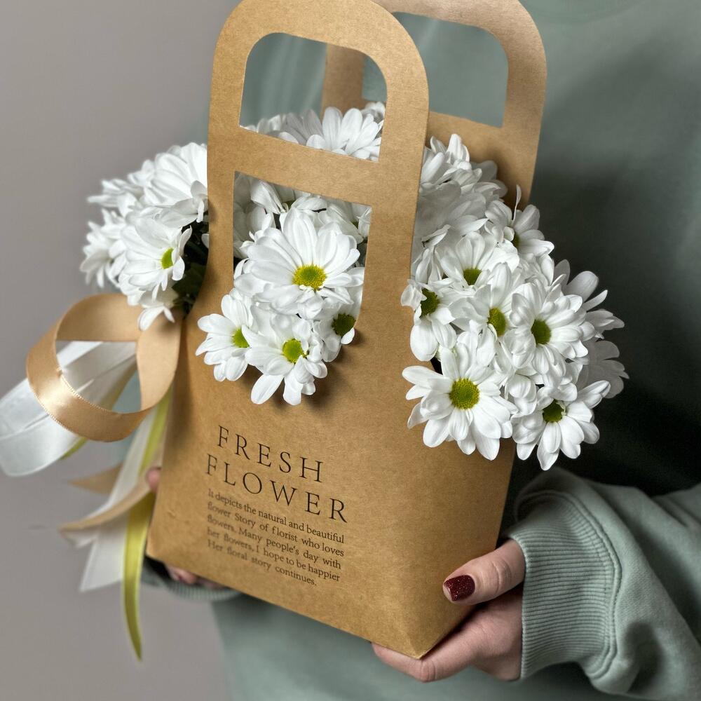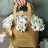 Comandă acum aranjamentul floral cu margarete albe în cutie tip pungă și lasă-te încântat de frumusețea naturii adusă în viața ta!