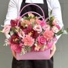 Cutie Tip Pungă în Nuanțe de Roz: Aranjamentul este prezentat într-o cutie tip pungă elegantă, de un roz delicat, care subliniază frumusețea florilor și conferă un aspect modern și atractiv. Această cutie este nu doar stilată, ci și practică, fiind ideală pentru a oferi cadou.