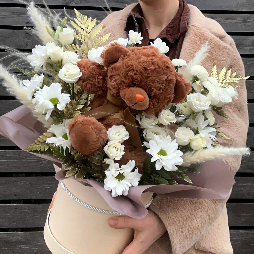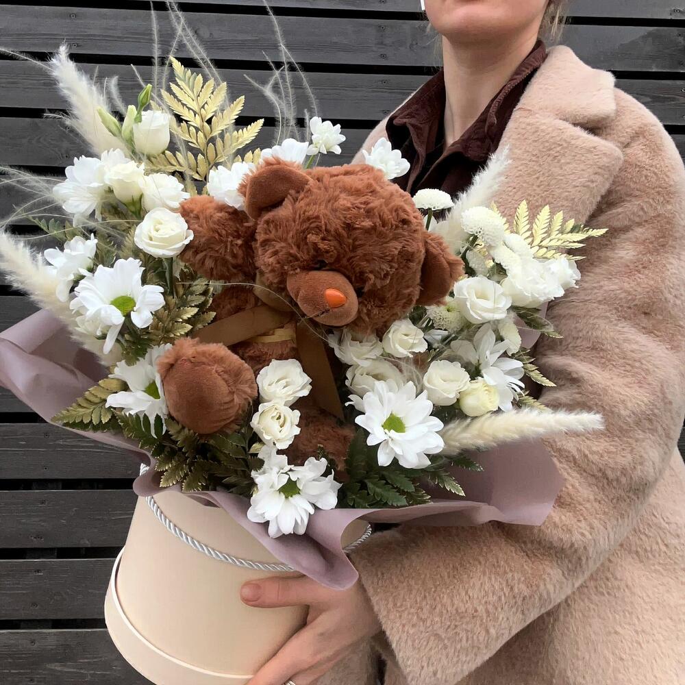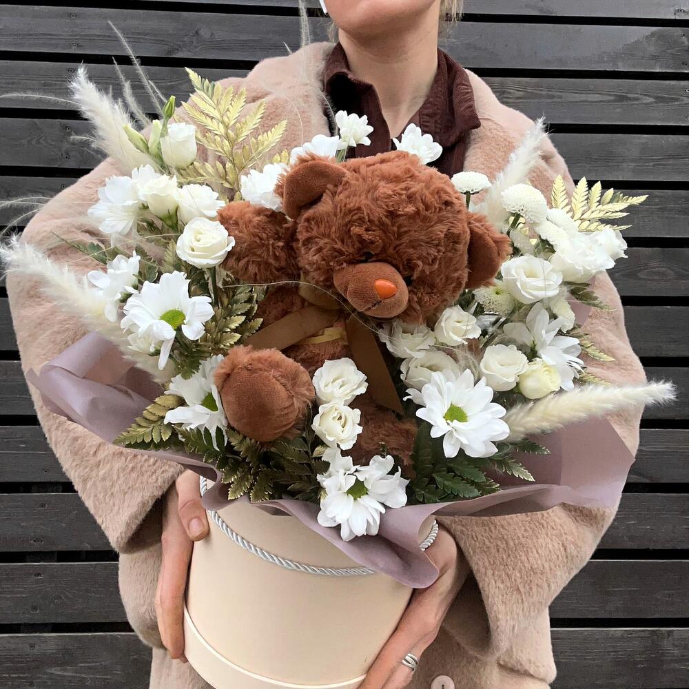 Acest aranjament este perfect pentru a arăta afecțiune și apreciere. Kombinarea florilor albe cu ursulețul de pluș face ca acest cadou să fie ideal pentru copil, tânără, sau oricine care apreciază gesturile dulci. Designul său îmbină naturalețea cu un element de jucărie, oferind o experiență de neuitat.