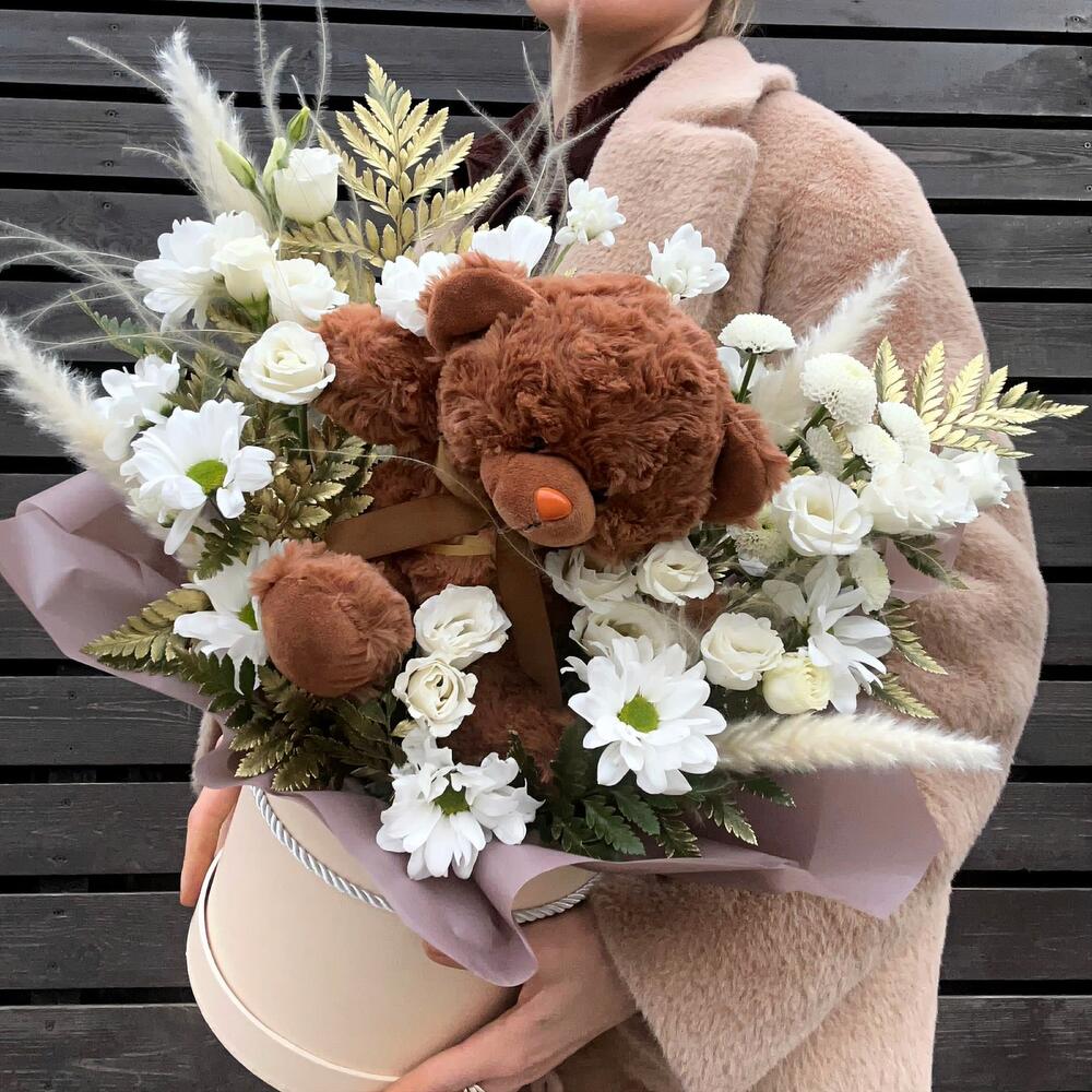 - Tipul Cutiei: Cutie înaltă de nuanță crem, elegantă și rafinată, care oferă un cadru perfect pentru florile delicate și ursuleț.