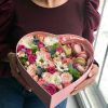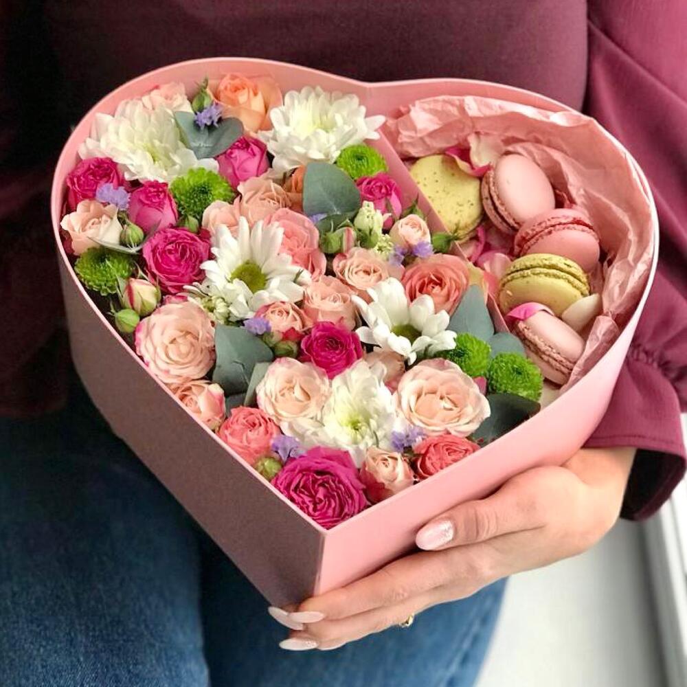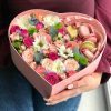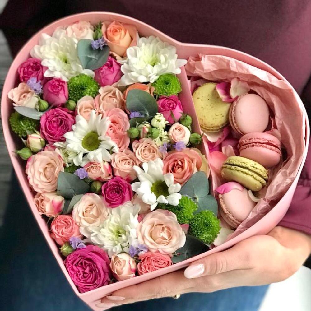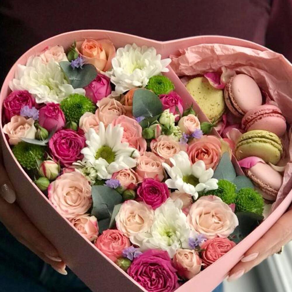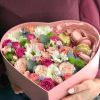 Aranjament Floral Flori și Macarons în Cutie Formă Inimă