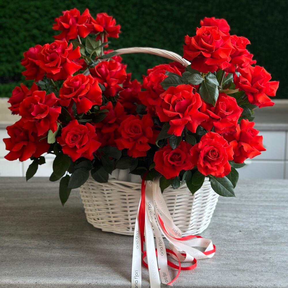 Aranjamentul floral în cos, compus din 51 de trandafiri roșii, este o alegere elegantă și romantică pentru a impresiona persoana dragă sau pentru a aduce un zâmbet pe chipul celor dragi.