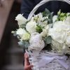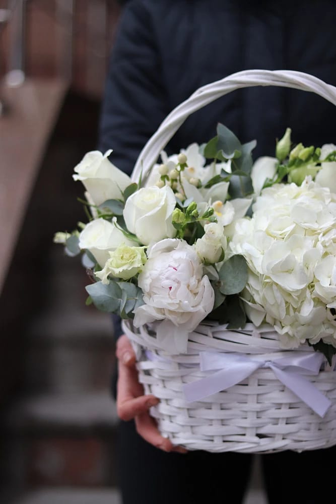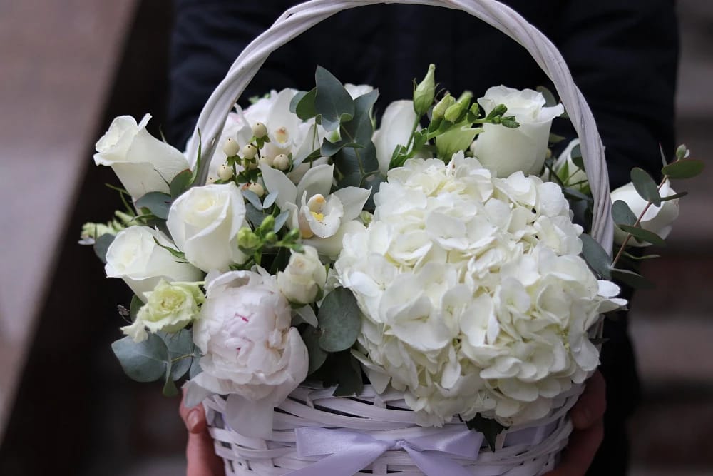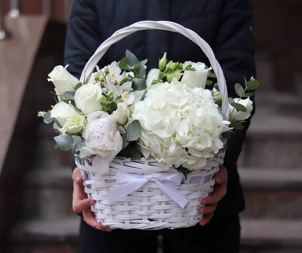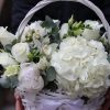 Aranjament Floral În Coș Cu Hortensie Albă Și Trandafiri Albi – Descriere