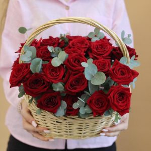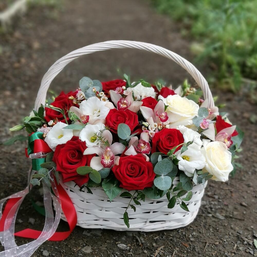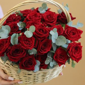 Descriere produs: Aranjament Floral în Coș din Trandafiri Roșii și Orhidee Roz