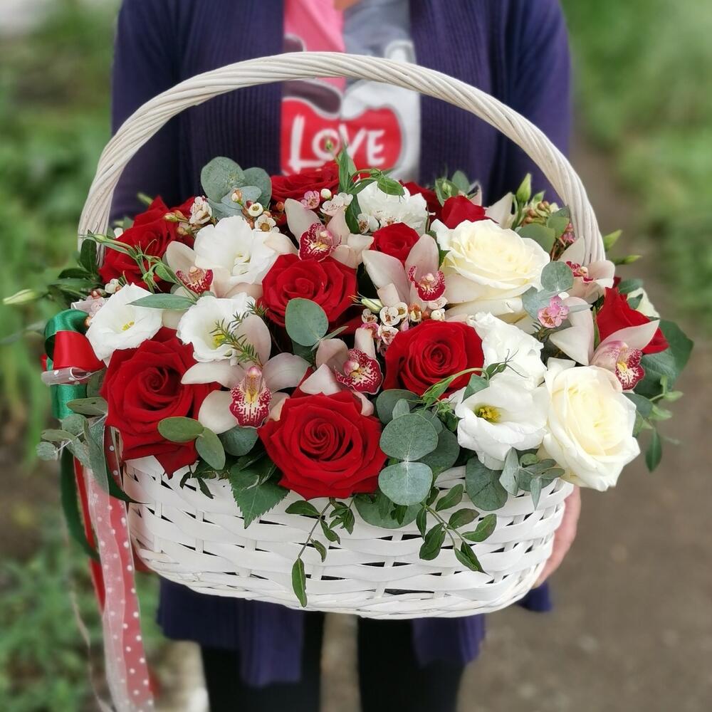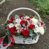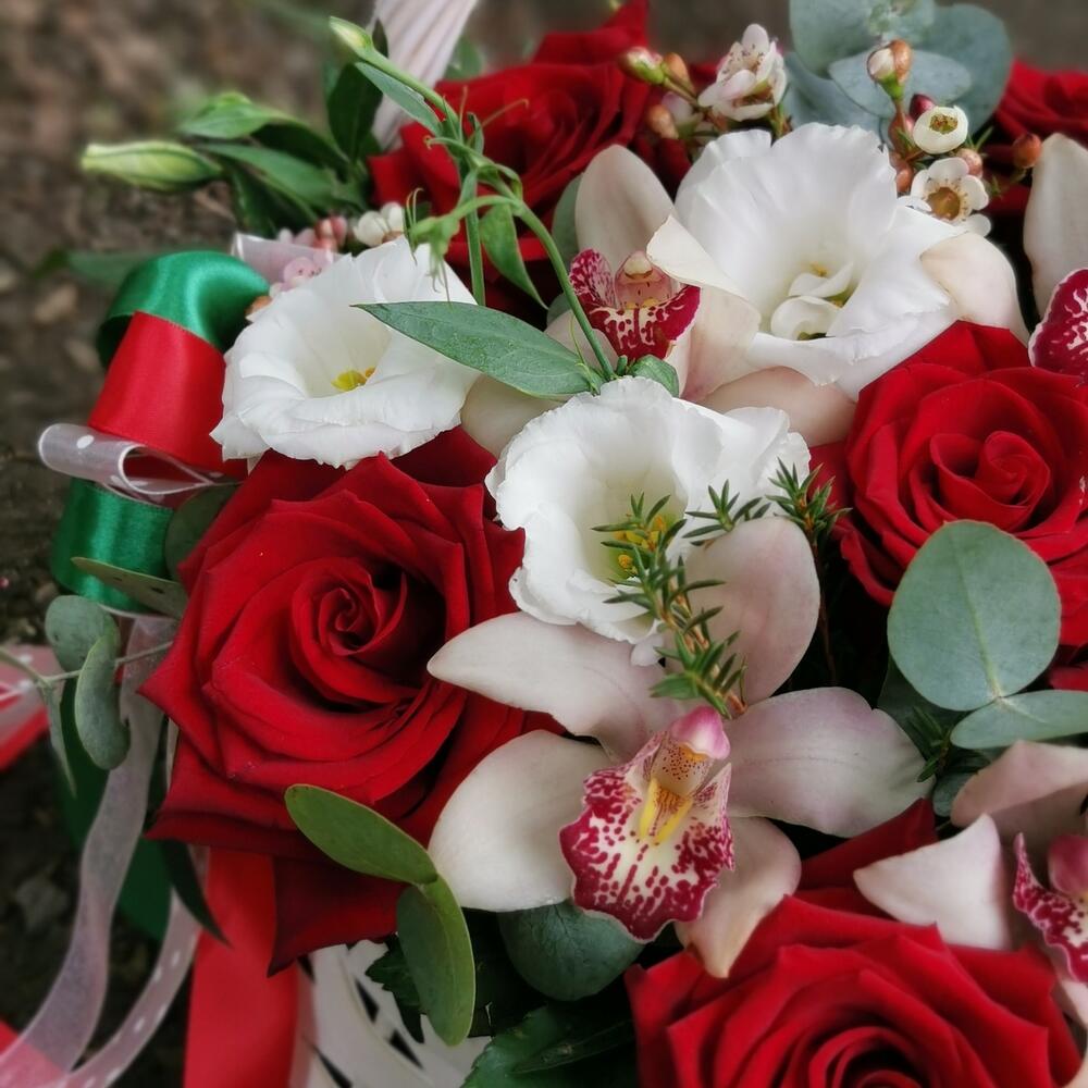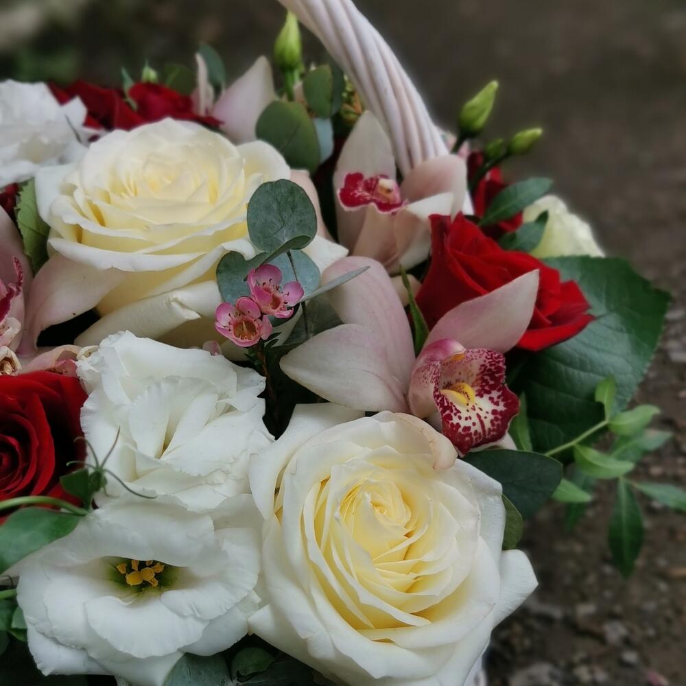 Acest aranjament floral rafinat, prezentat într-un coș alb elegant, aduce un strop de frumusețe și eleganță în orice spațiu. Combinând trandafiri roșii pasionali cu delicatețea orhideelor roz, acest aranjament este ideal pentru a transmite emoții profunde și a sărbători momente speciale.