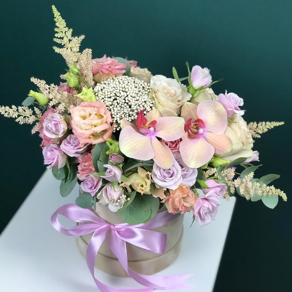 | FLORI | Trandafiri, Mini Rose Orhidee Eustome Astilbia Diametru cutiei 27 cm |