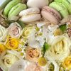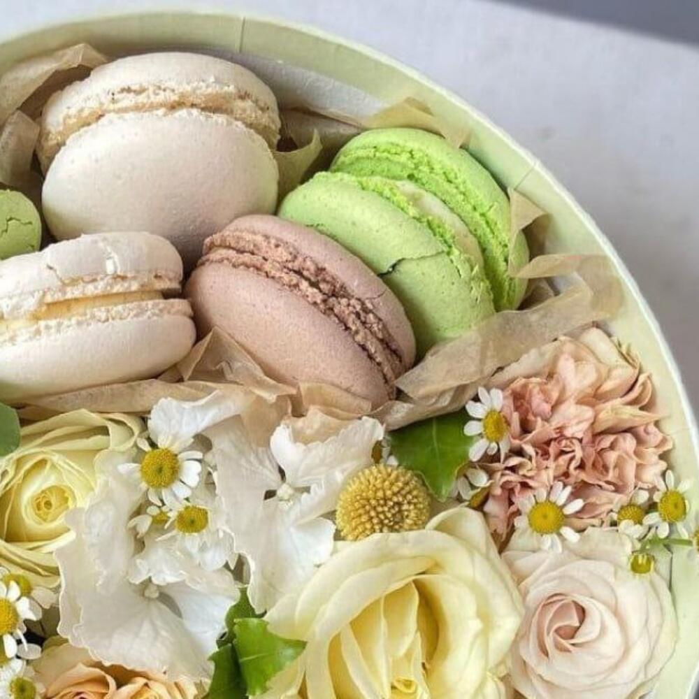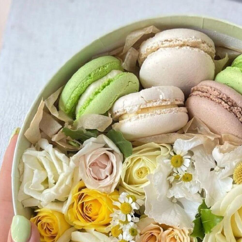 Descoperiți eleganța rafinată cu Aranjamentul Floral în Cutie cu Flori în Nuanțe Deschise și Macarons! Cu un diametru de 25 cm și o înălțime de 18 cm, acest aranjament spectaculos va aduce un strop de frumusețe în orice încăpere.