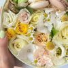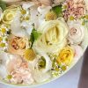 Conținutul său delicat include: 1 fir de hortensie albă, 1 fir de margaretă albă, 2 fire de eustomă albă, 3 fire de trandafiri galbeni, 1 fir de trandafir alb și 1 fir de trandafir roz pal, toate perfect îmbinate pentru a crea o atmosferă deosebită. În plus, cei 5 macarons delicioși adaugă un element dulce și elegant, făcând din acest aranjament cadoul ideal pentru orice ocazie.