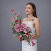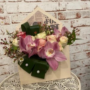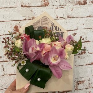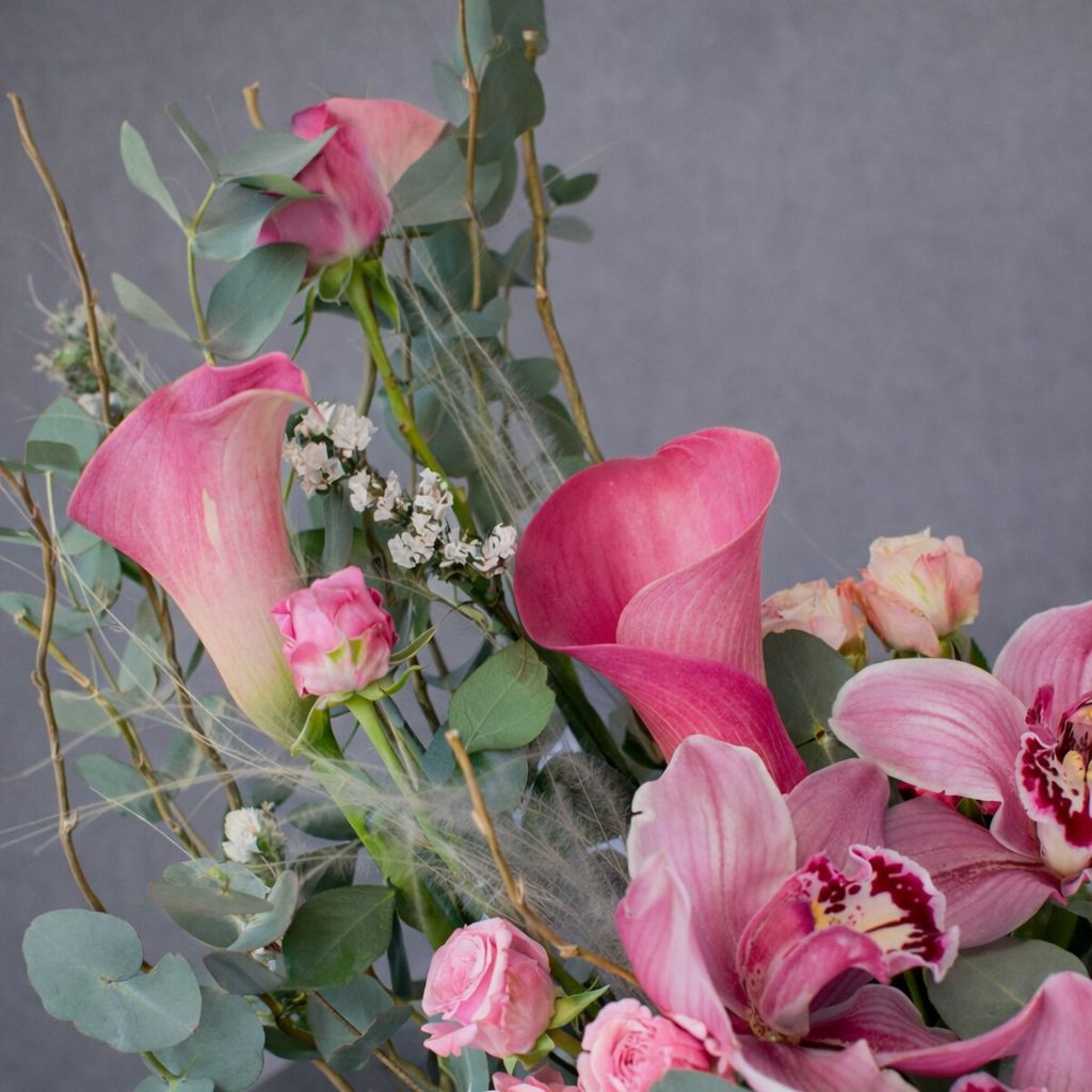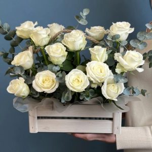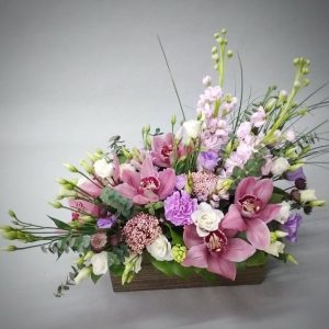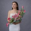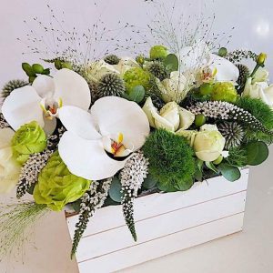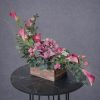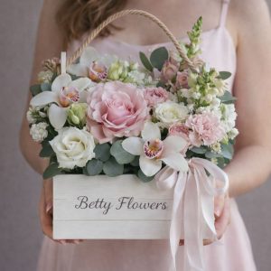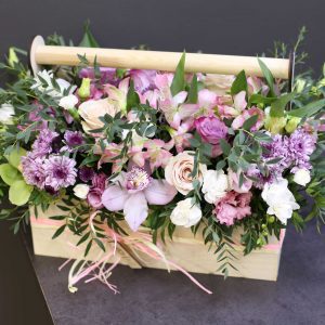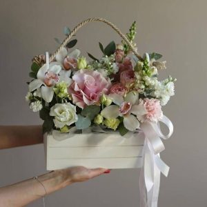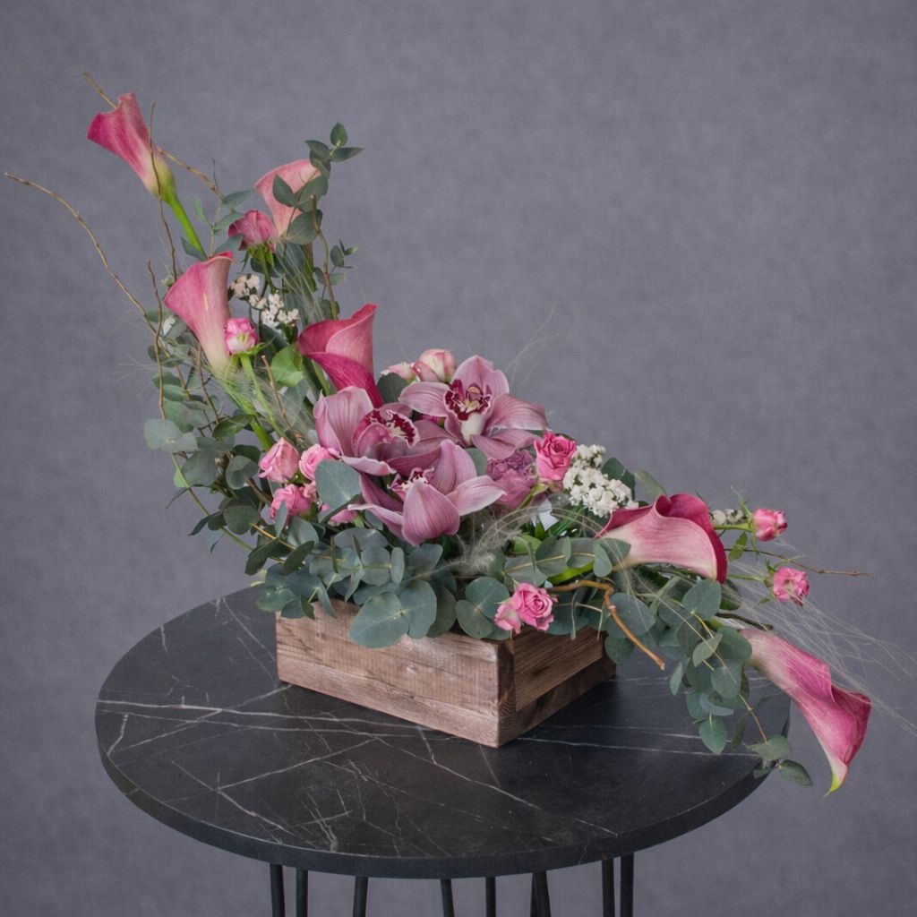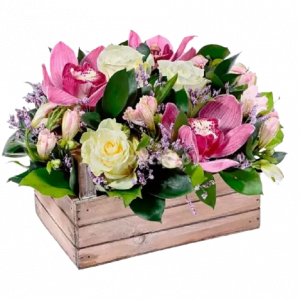 Aranjament floral elegant, realizat manual, potrivit pentru cadouri speciale, evenimente sau decor premium. Compoziția îmbină flori rafinate în nuanțe de roz și verde, așezate într-o lădiță din lemn, pentru un efect modern și sofisticat. Ideal pentru livrare flori în București și comenzi online.