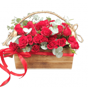 Aranjamentul este realizat în lădiță din lemn natural și poate prezenta mici variații în funcție de sezon, păstrând stilul și valoarea estetică.