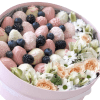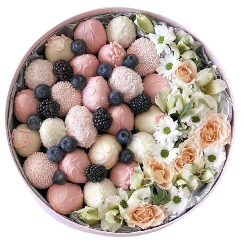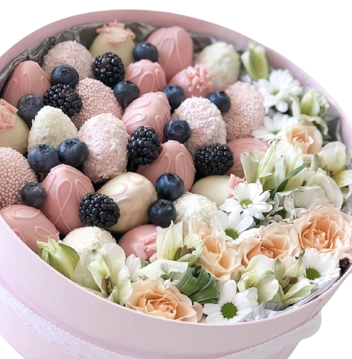 | Fructe | Capsuni in ciocolata 25 buc si aranjament floral cutia cu diametru 27 cm |