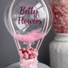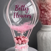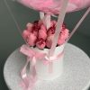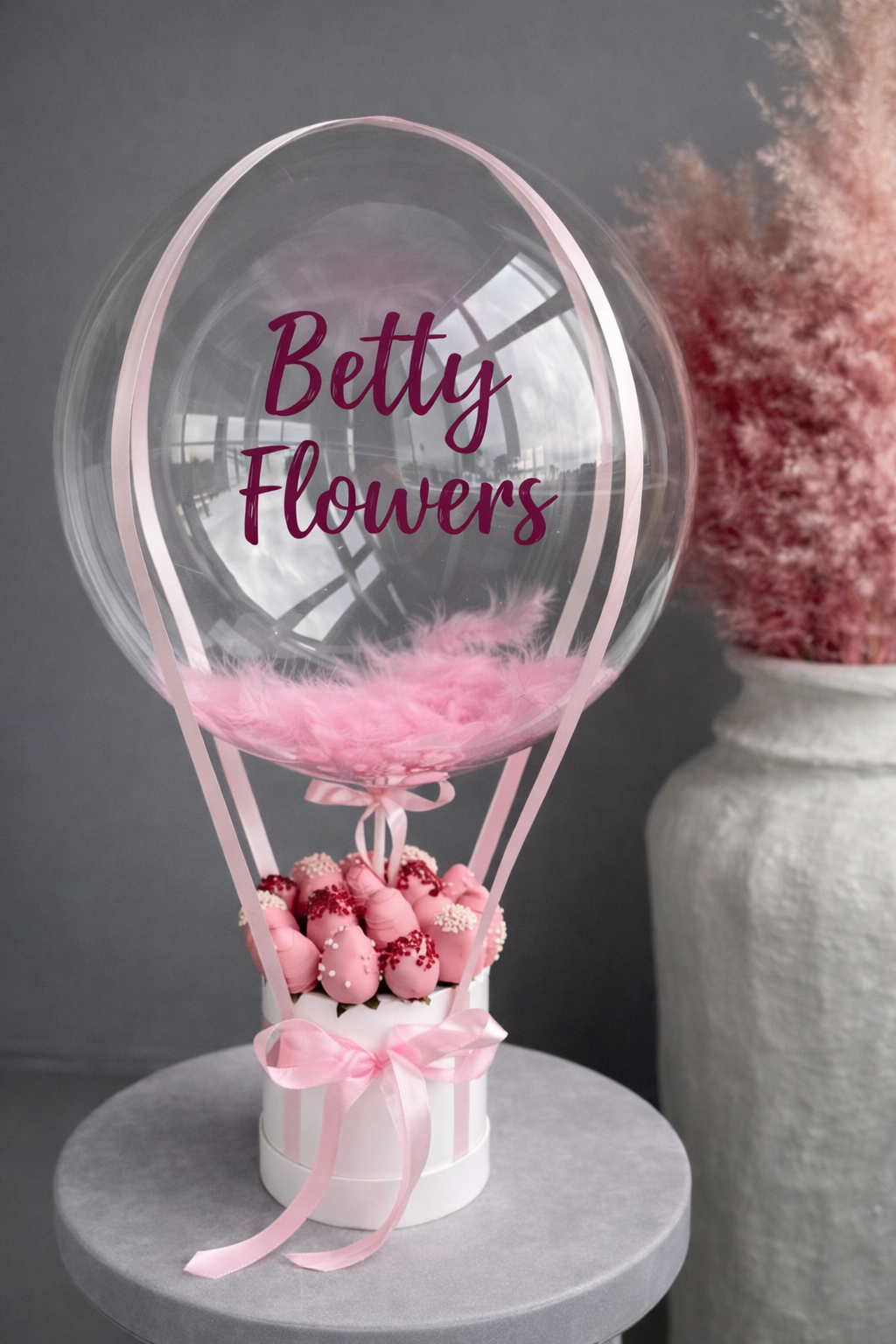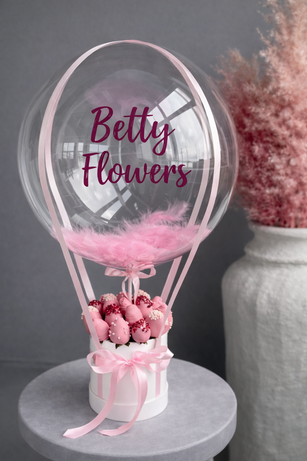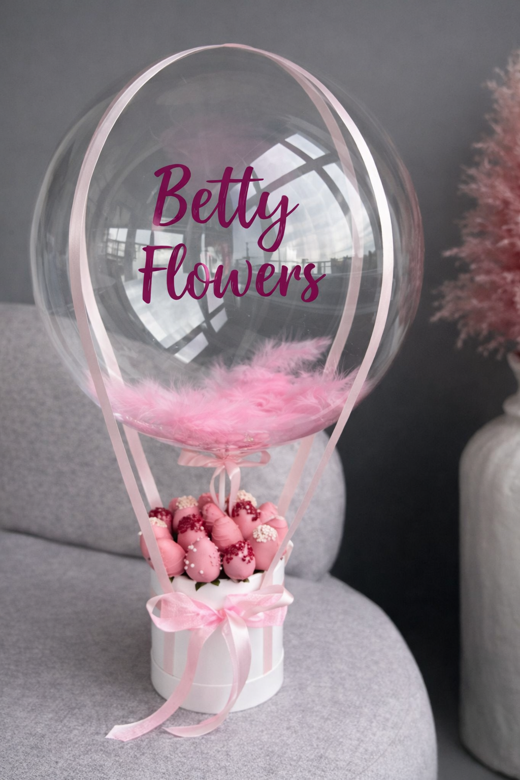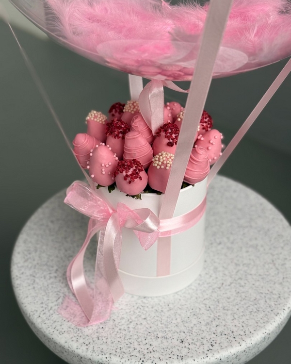 Aranjament premium cu căpșuni în ciocolată belgiană roz, prezentat într-un decor elegant cu balon Bobo și accente delicate, ideal pentru cadouri romantice, aniversări sau surprize speciale.