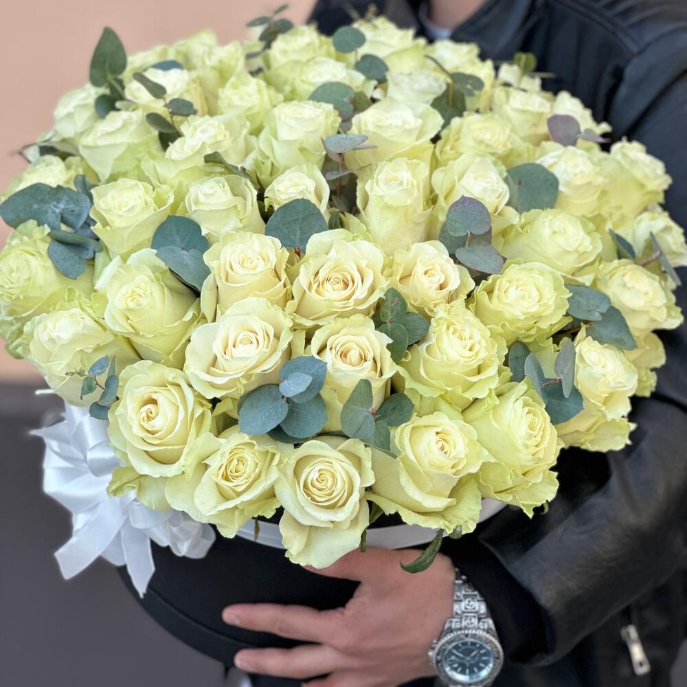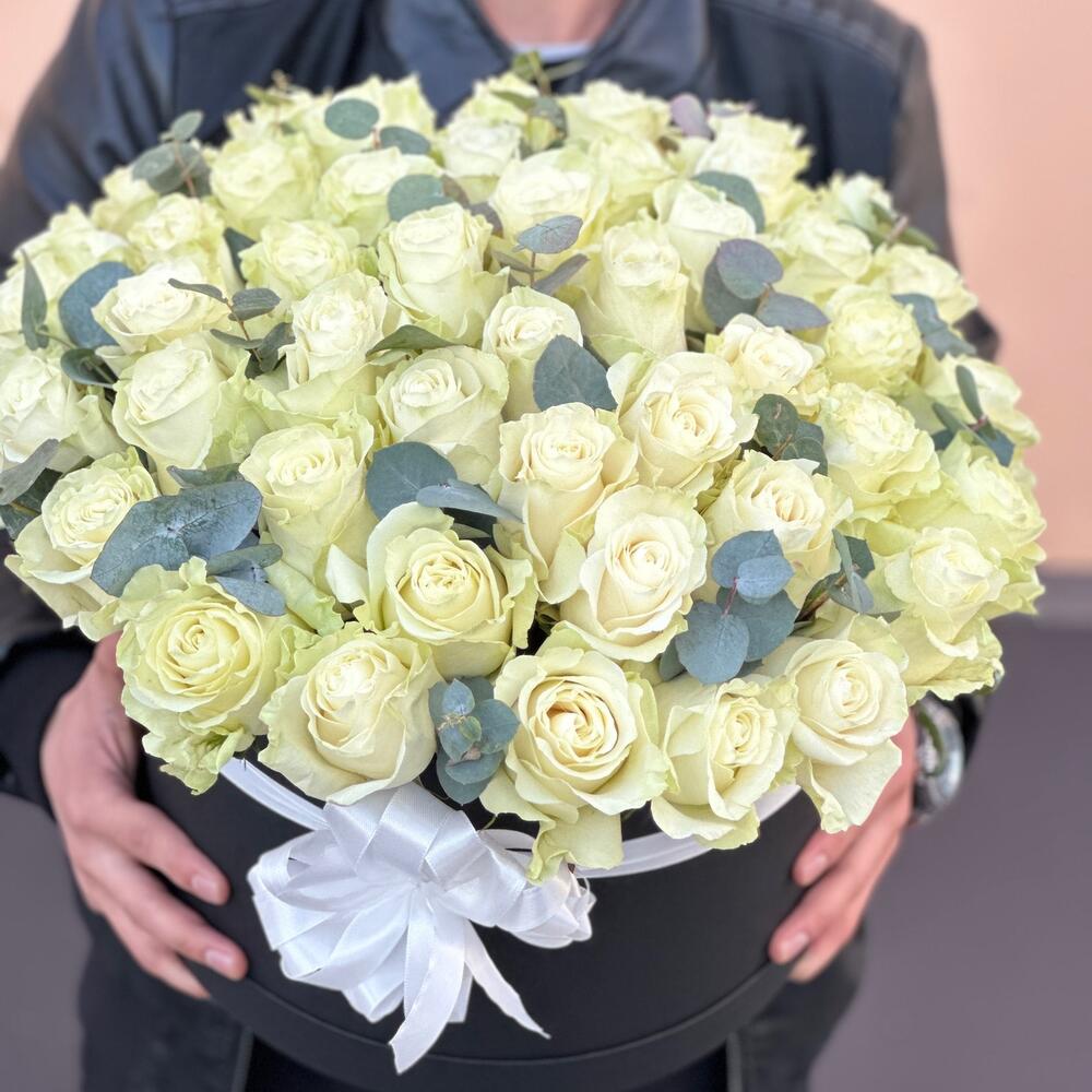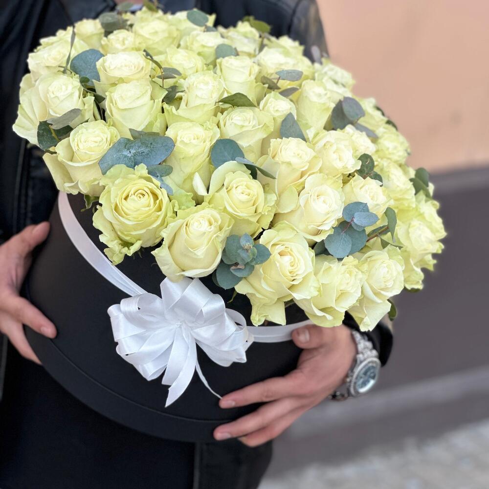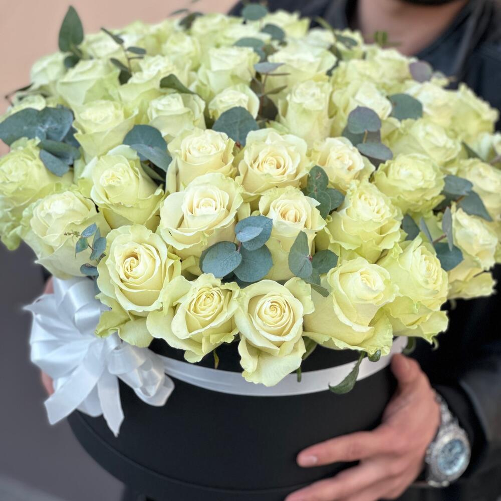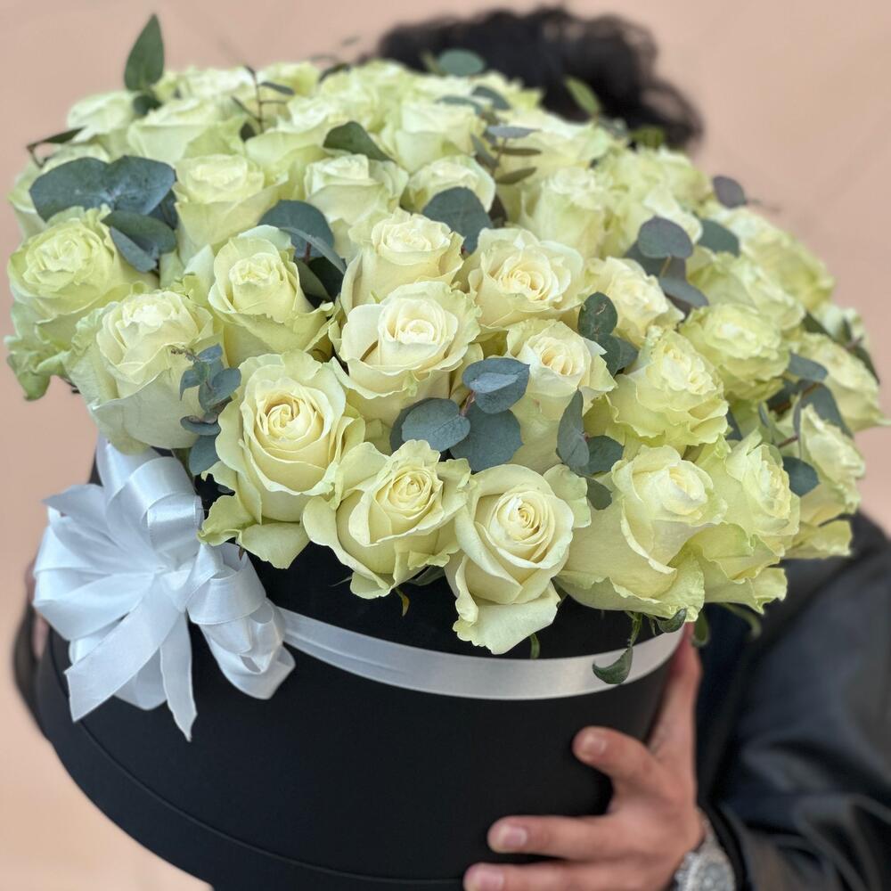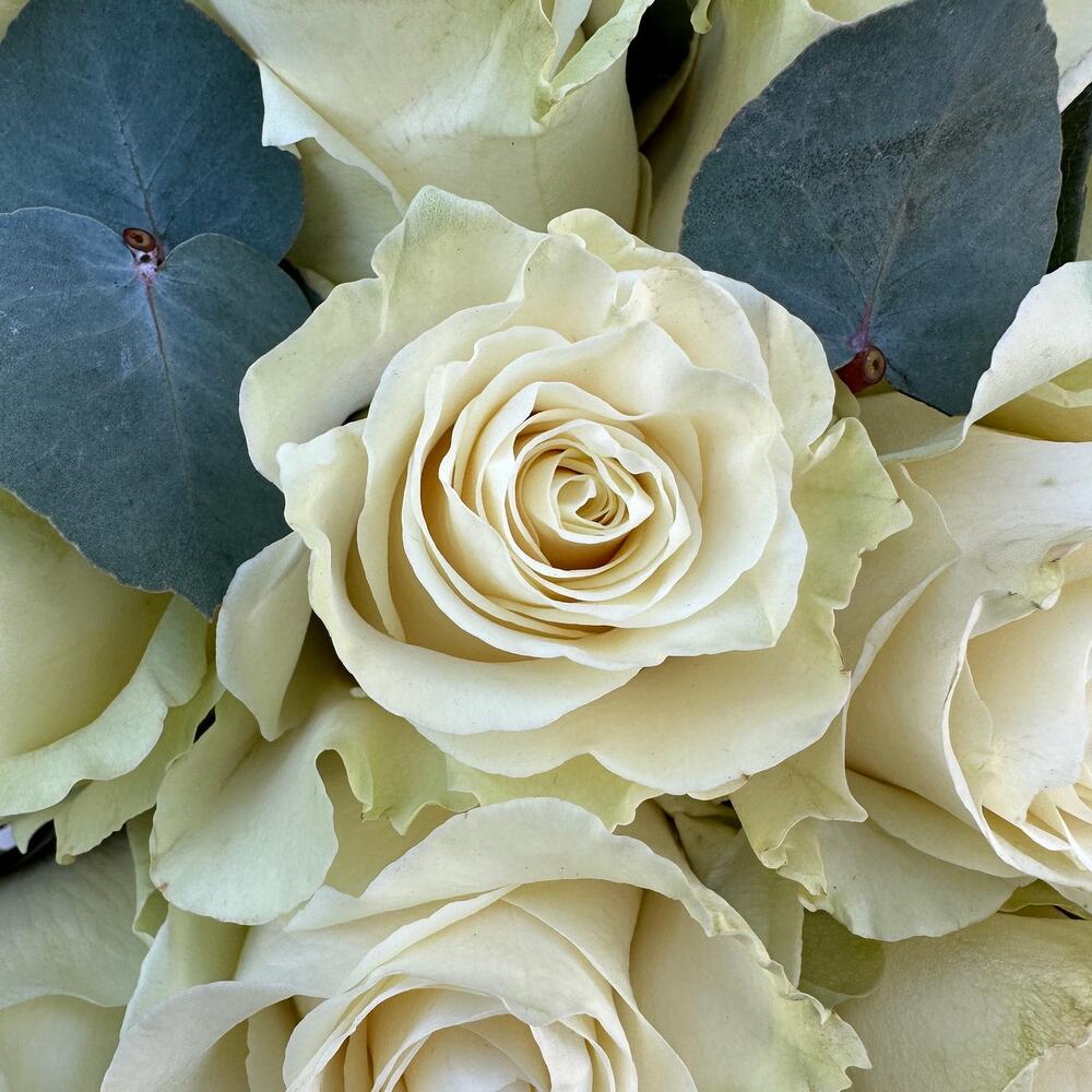 Încântă-ți simțurile cu acest aranjament floral elegant care combină frumusețea pură a 51 de trandafiri albi de Olanda cu prospețimea adusă de 6 fire de eucalipt. Acest aranjament este realizat cu grijă și este prezentat într-o cutie neagră sofisticată, perfectă pentru a adăuga o notă de rafinament oricărei ocazii.