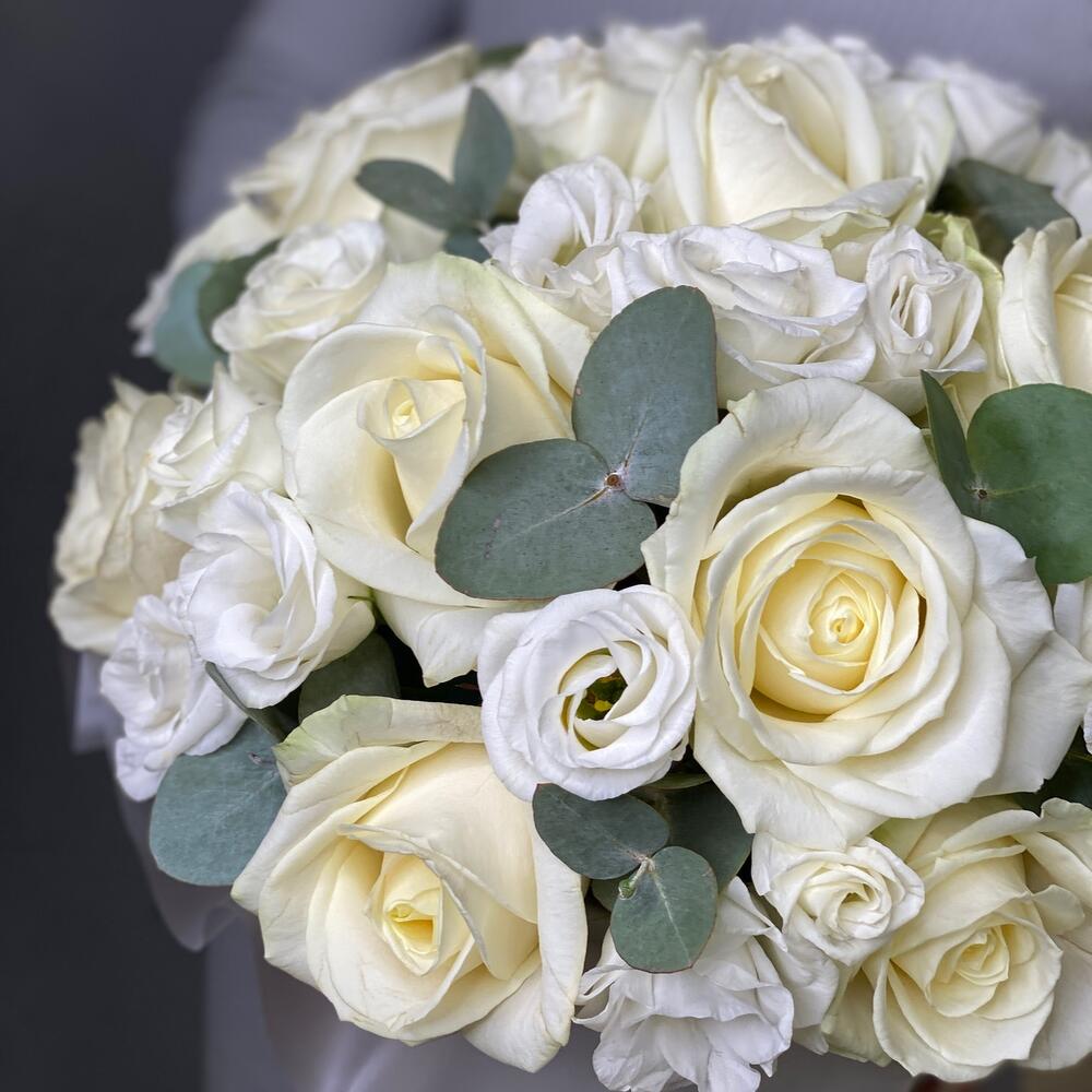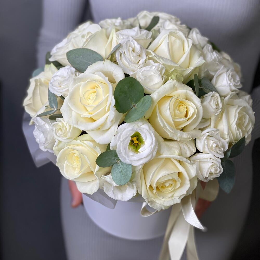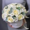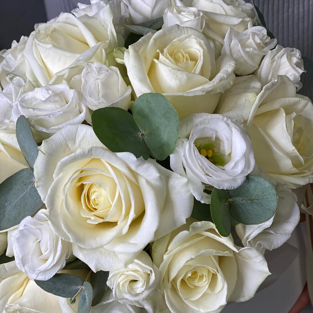 Descriere produs: Aranjament în Cutie cu Trandafiri și Eustome Albe
