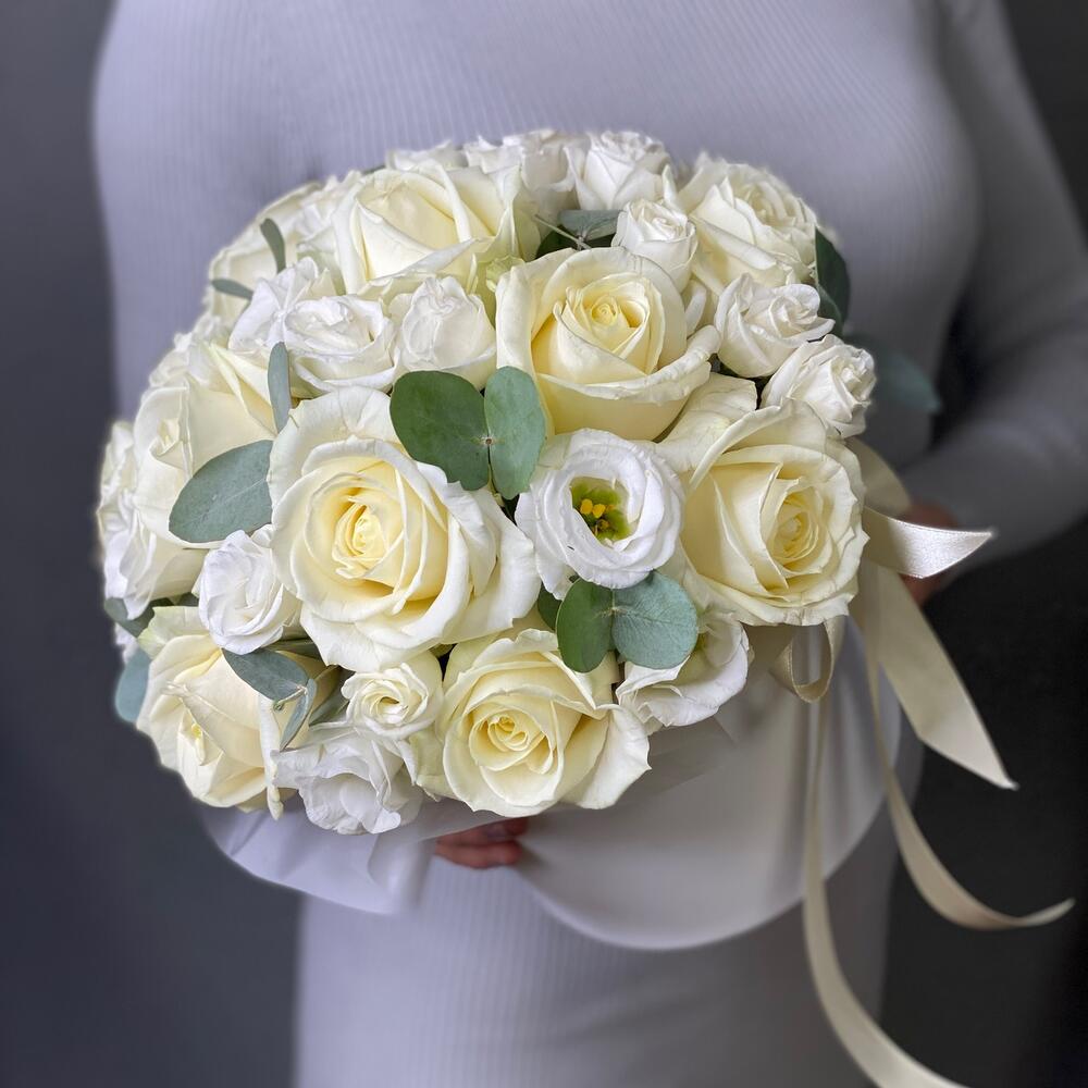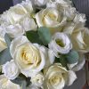 - 5 fire de eustome albe: Cu florile lor delicate, eustomele adaugă o notă de rafinament și un aspect proaspăt aranjamentului, completând frumusețea trandafirilor.