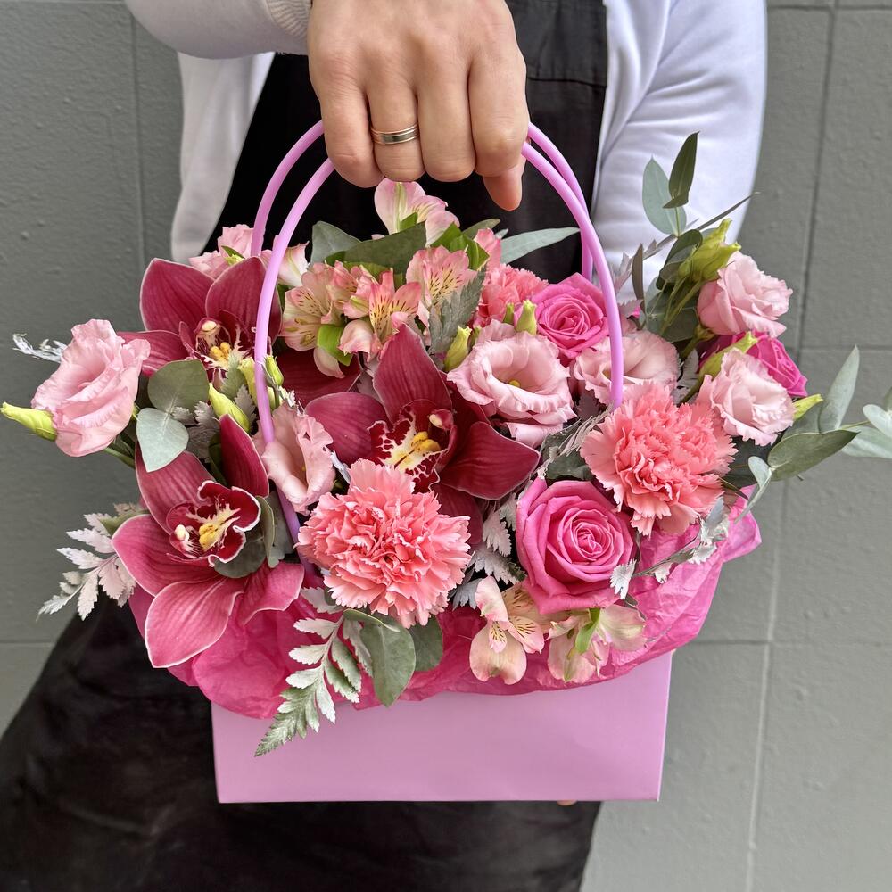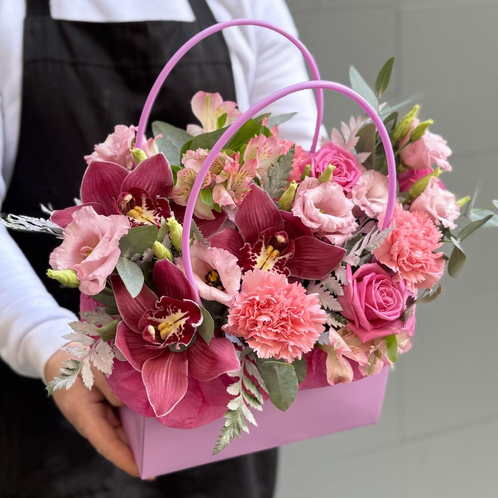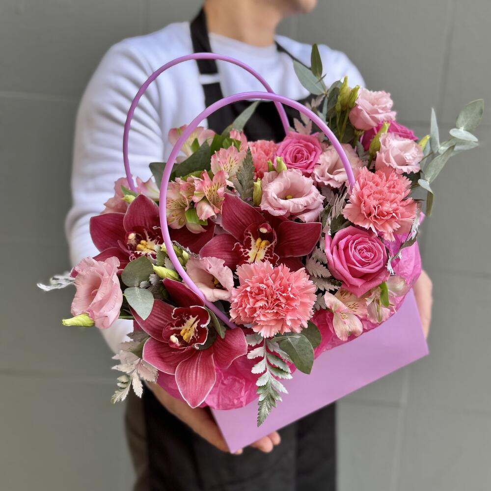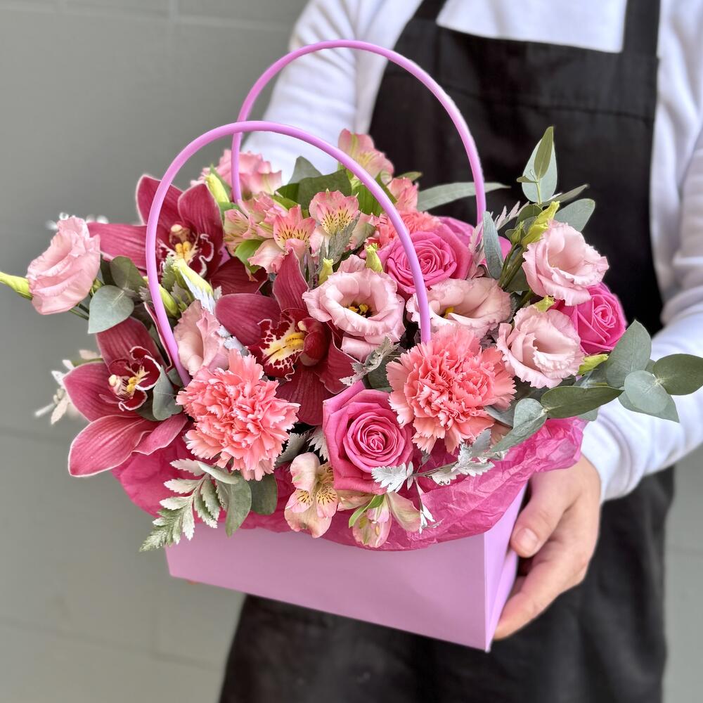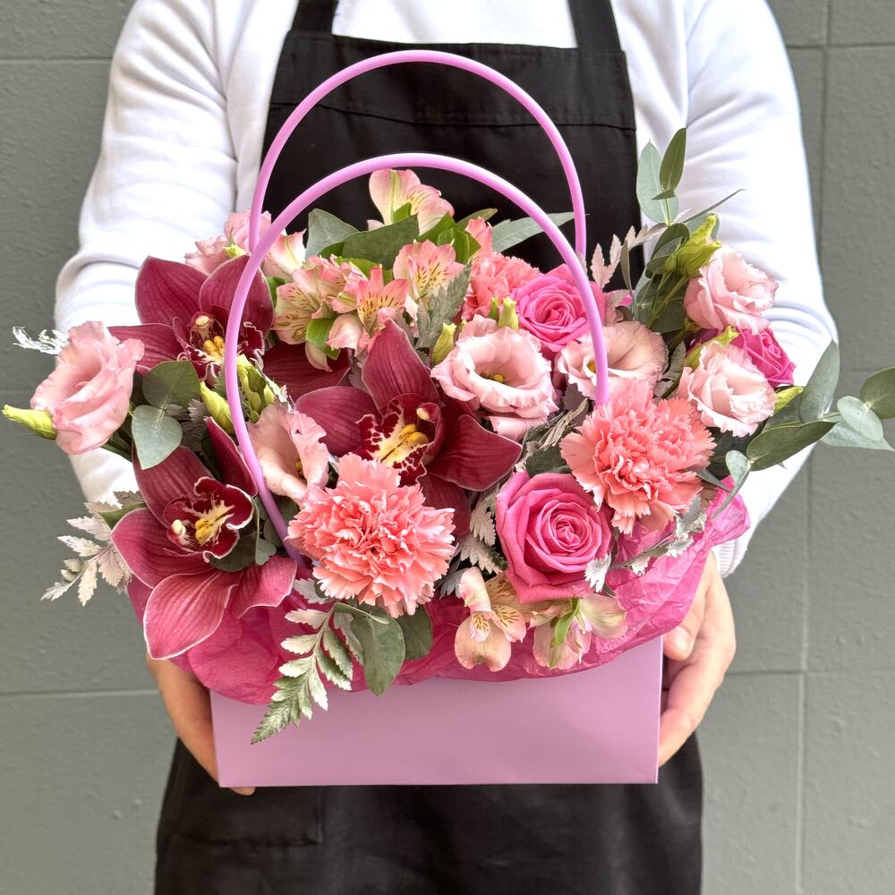 Cutie Tip Pungă în Nuanțe de Roz: Aranjamentul este elegant ambalat într-o cutie tip pungă de un roz delicat, care subliniază frumusețea florilor și oferă un aspect modern și atractiv. Această cutie este perfectă pentru a fi oferită cadou sau pentru a aduce un accent floral în decorul casei tale.