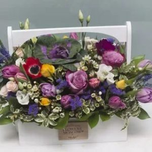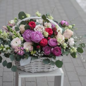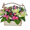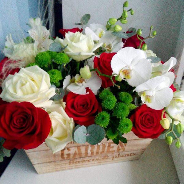 Contine:7 fire de phalynopsis alb, 8 fire de trandafiri rosii, 5 fire de trandafiri albi, 4 fire de santine verzi, 4 bucati de astromerii albe, 4 fire de eucalipt.
