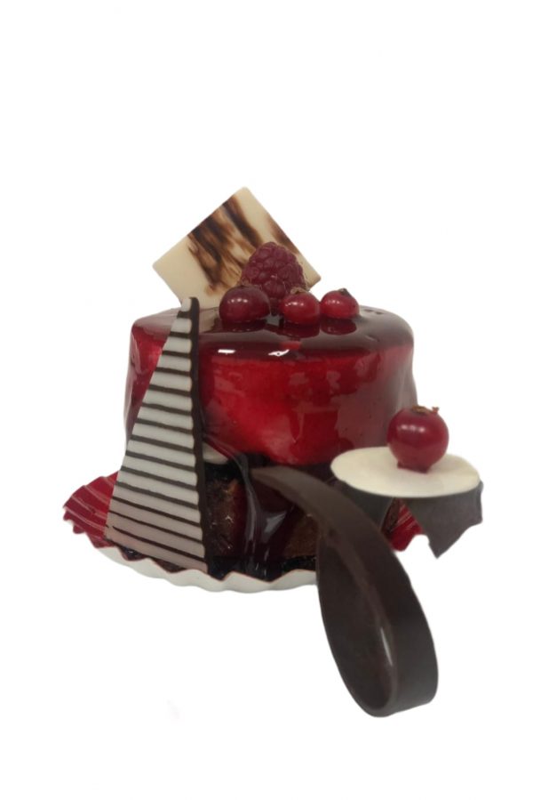 Blat concentrat de cacao ,crema cu ciocolata ,mousse cu ciocolata alba si fructe de padure,glazura de visine