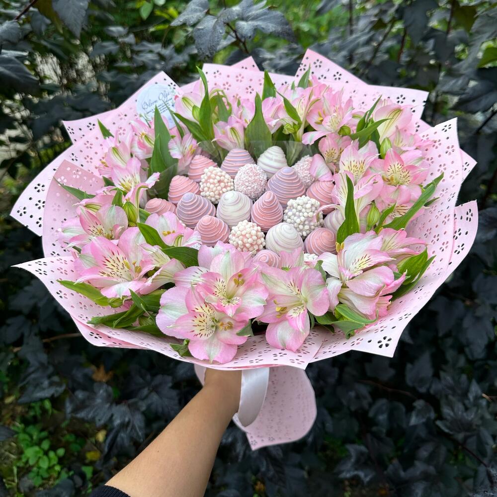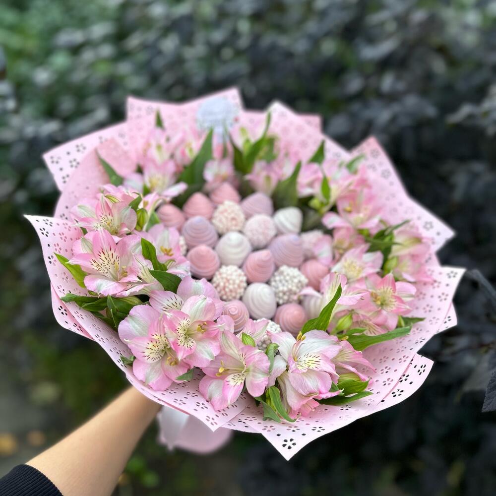 Fiecare buchet este creat cu atenție și pasiune, oferind o experiență unică pentru cei care îl primesc. Capsunile suculente acoperite în ciocolată se îmbină armonios cu frumusețea și eleganța astromeliei roz, rezultând un cadou memorabil și rafinat.