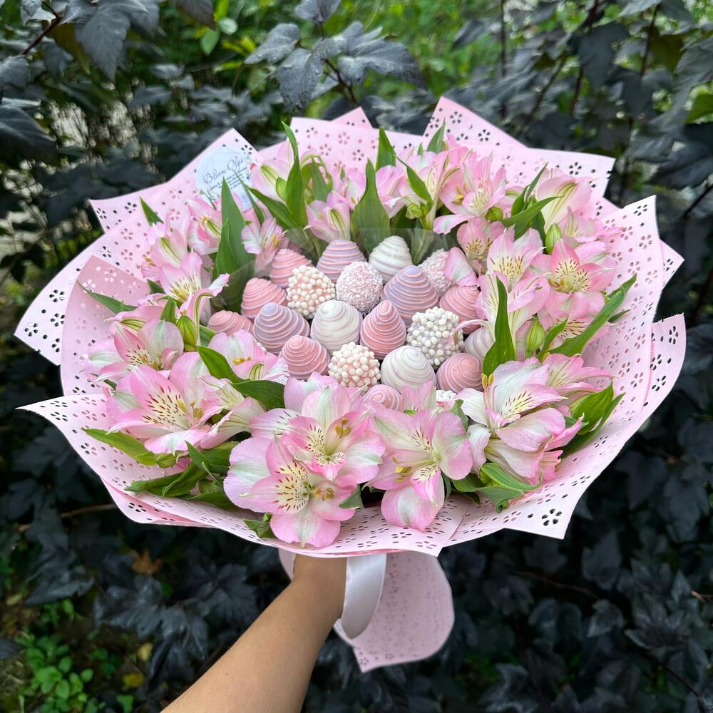 Buchetul „Capsuni în Ciocolată cu Astromelie Roză” este alegerea perfectă pentru a aduce un zâmbet pe chipul persoanei dragi sau pentru a aduce un strop de dulceață într-o zi obișnuită. Oferă acest buchet special și vei cuceri inima oricui cu gusturile sale excepționale și aspectul său rafinat.
