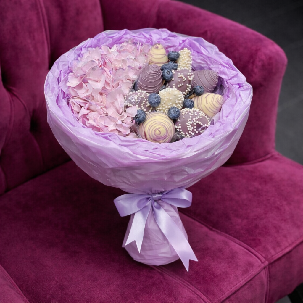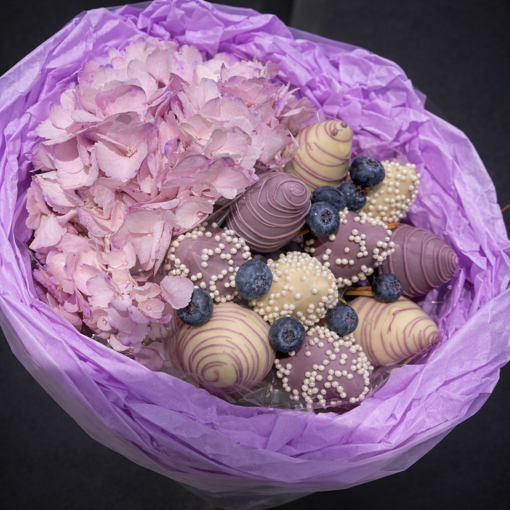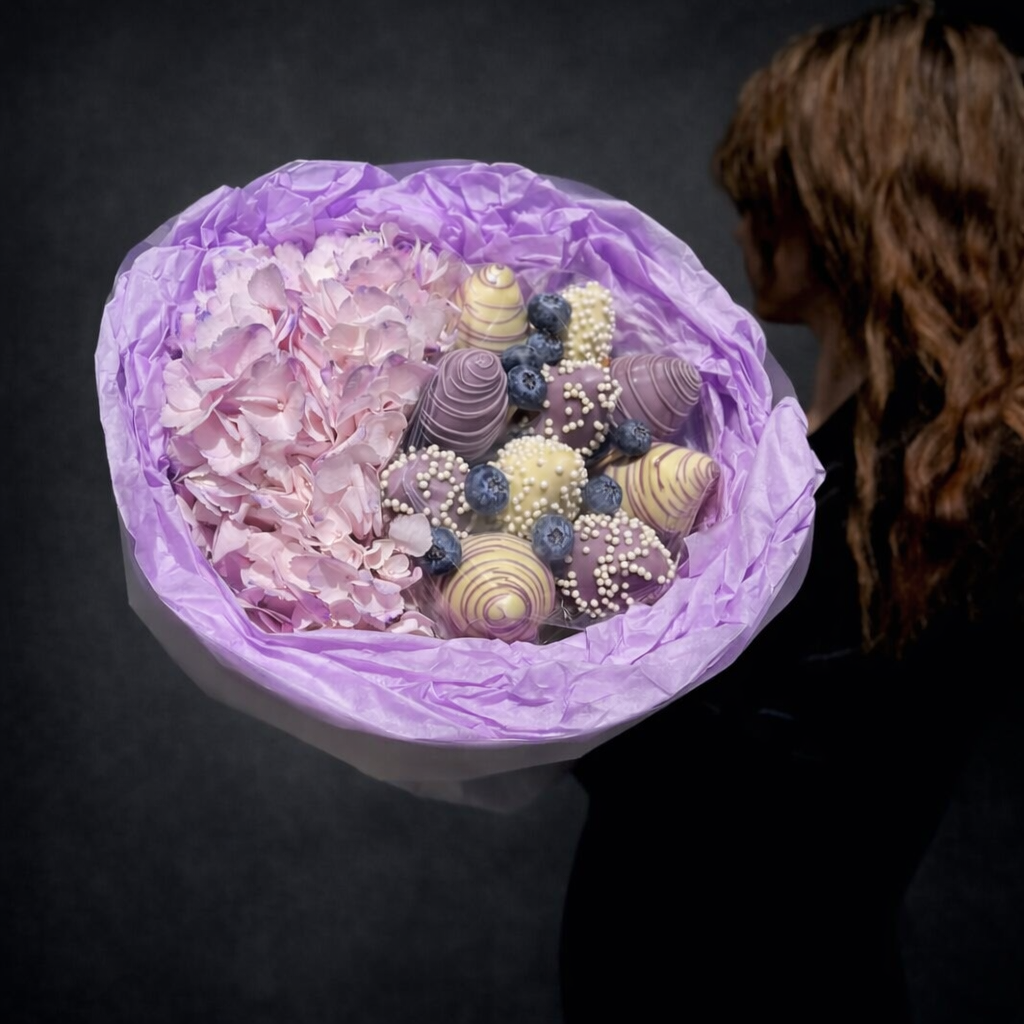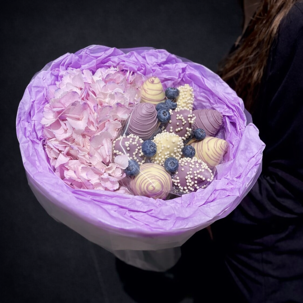 Descoperă un buchet cu căpșuni în ciocolată și hortensii mov, un cadou elegant și modern, perfect pentru aniversări, surprize romantice sau momente speciale.