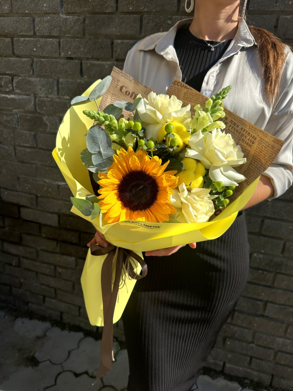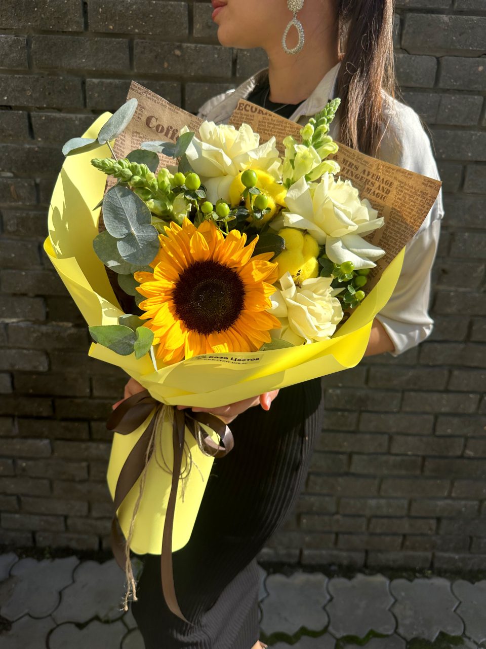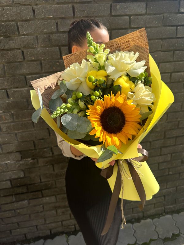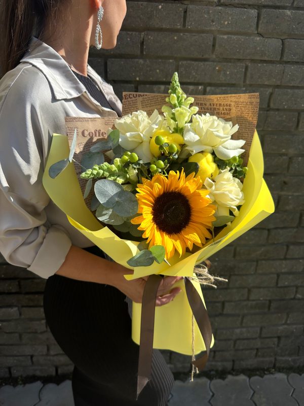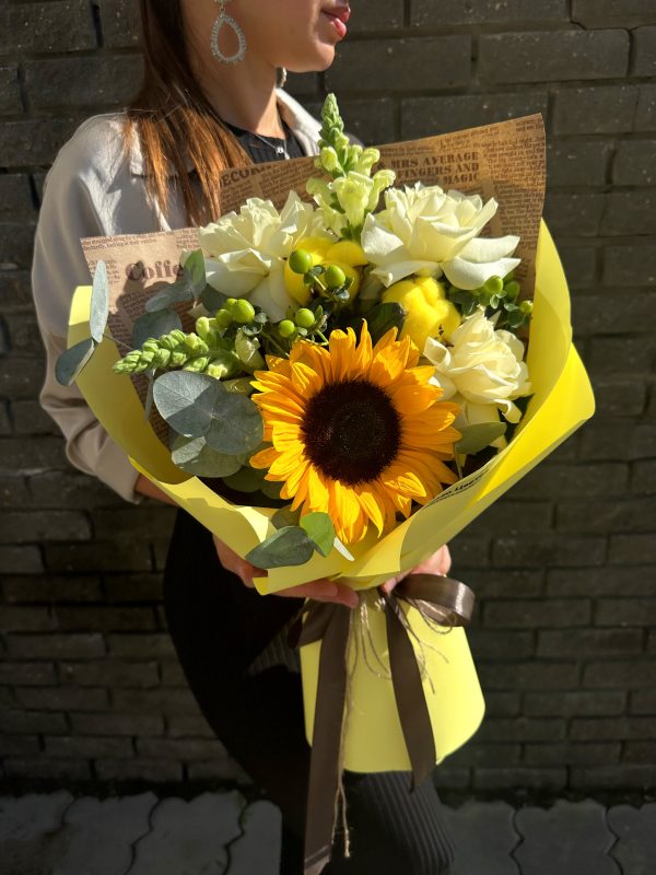 Informații suplimentare: Floarea soarelui, cu conotațiile sale de căldură și optimism, combinată cu eleganța florilor albe, face din acest buchet o alegere perfectă pentru a exprima iubirea, aprecierea sau prietenia.