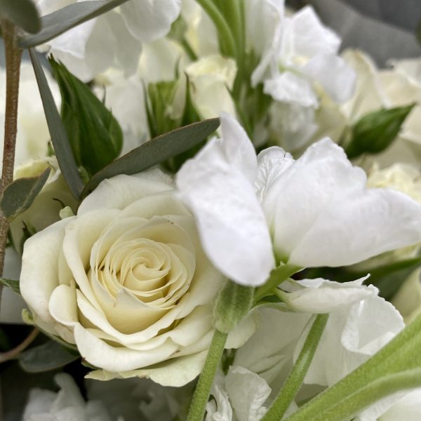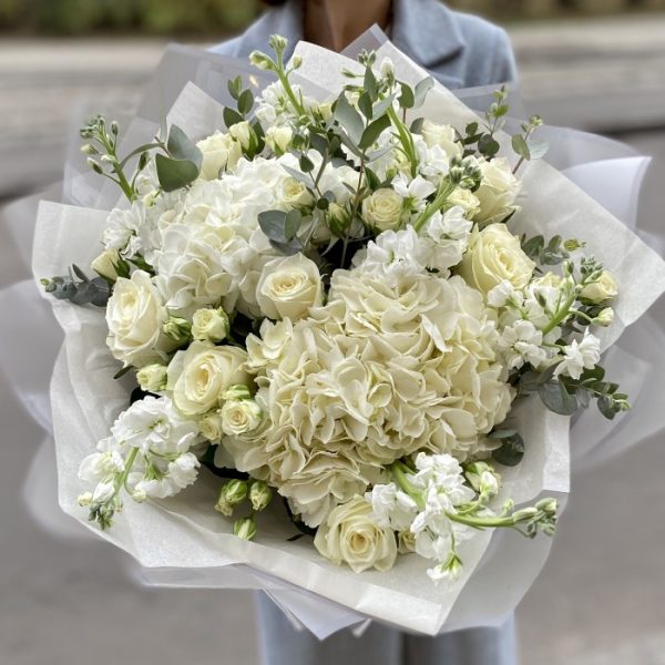 Descoperă frumusețea pură a naturii cu Buchetul cu Flori Albe și Hortensie! Acest buchet elegant este compus din 4 fire de eucalipt, 3 fire de gipsofila, 10 fire de minirose albe, 9 fire de trandafiri albi, 7 fire de matiola albă, 5 fire de ruscus, toate armonizate perfect într-un ambalaj verde alb. Fiecare floare transmite o poveste delicată și rafinată, creând o atmosferă plină de prospețime și eleganță. Alege acest buchet minunat pentru a oferi un cadou memorabil sau pentru a aduce un strop de natură în propria locuință. Comandă acum Buchetul cu Flori Albe și Hortensie și bucură-te de frumusețea simplă și autentică a florilor albe!