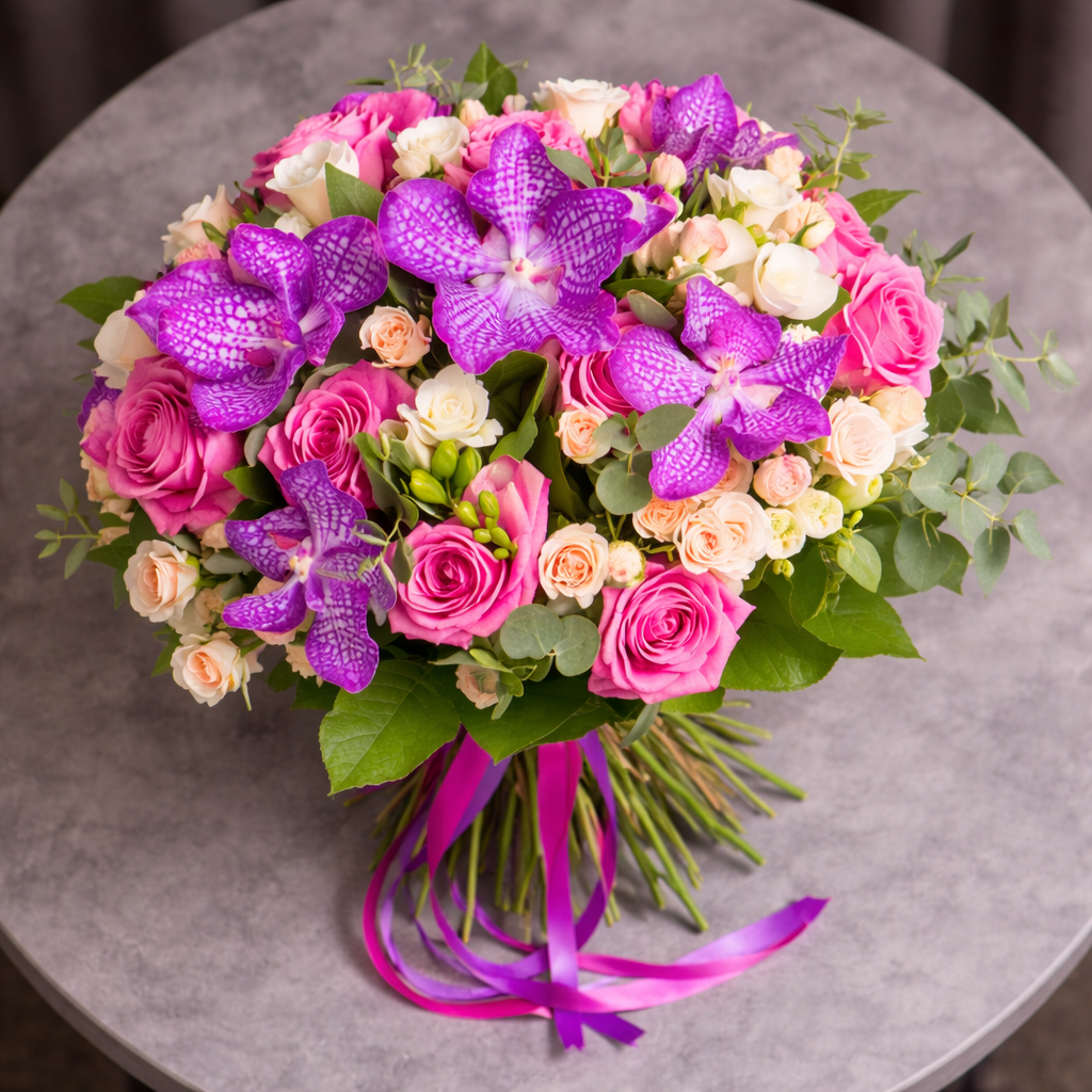 Buchet Elegant cu Orhidee Vanda Mov și Trandafiri Roz este un aranjament floral spectaculos, creat pentru a impresiona prin culori vibrante și eleganță naturală. Combinația dintre orhideele exotice Vanda mov, trandafirii delicati și florile parfumate transformă acest buchet într-un cadou ideal pentru aniversări, zile de naștere, ocazii speciale sau pentru a transmite emoții sincere. Buchetul este realizat cu flori proaspete și atent selecționate, oferind un aspect luxuriant și rafinat.