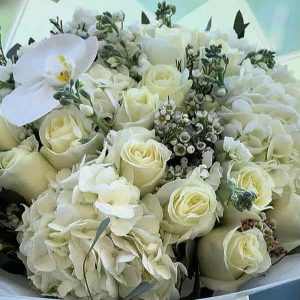 - Hortensie Albă (1 fir): Hortensia albă, cu volumul său luxos, simbolizează puritatea și sinceritatea, fiind un element central al buchetului și oferind un aer sofisticat.