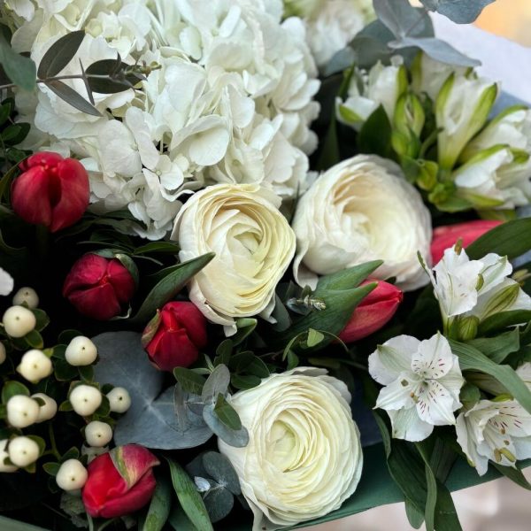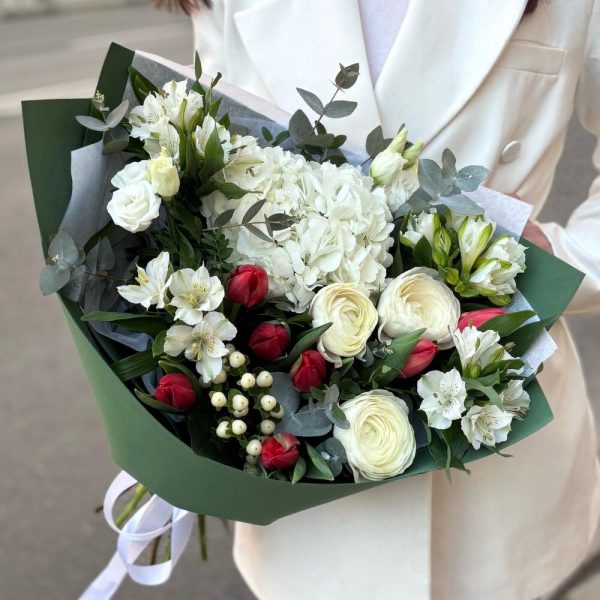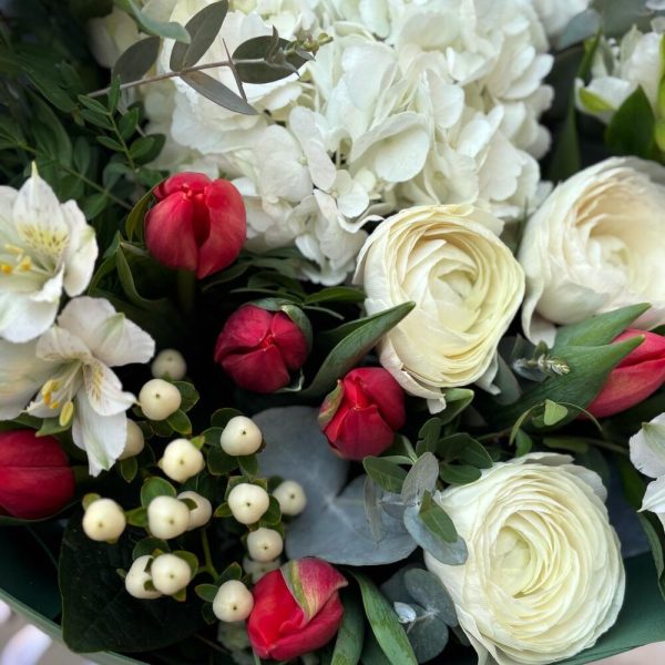 Acest buchet cu flori de primăvară din hortensie albă și lalele roșii este perfect pentru aniversări, zile de naștere, sau alte evenimente speciale, aducând un strop de culoare și bucurie în viața celor dragi.