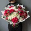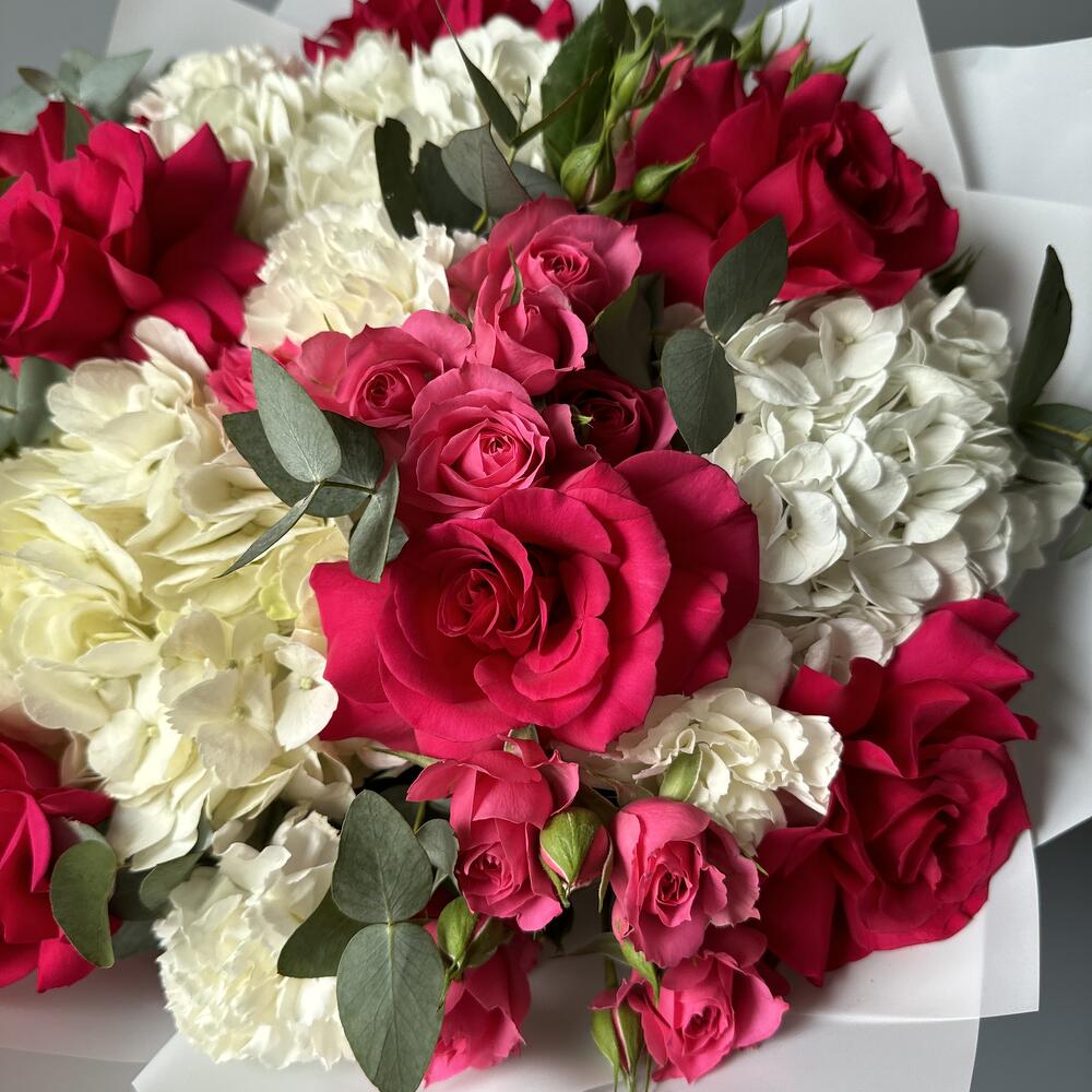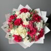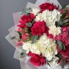 Buchet cu Hortensie Albă și Trandafiri Ciclam – Descriere Produs