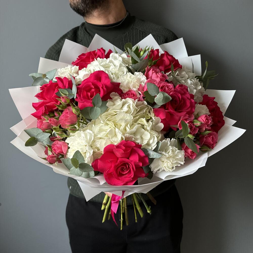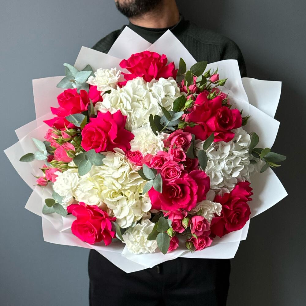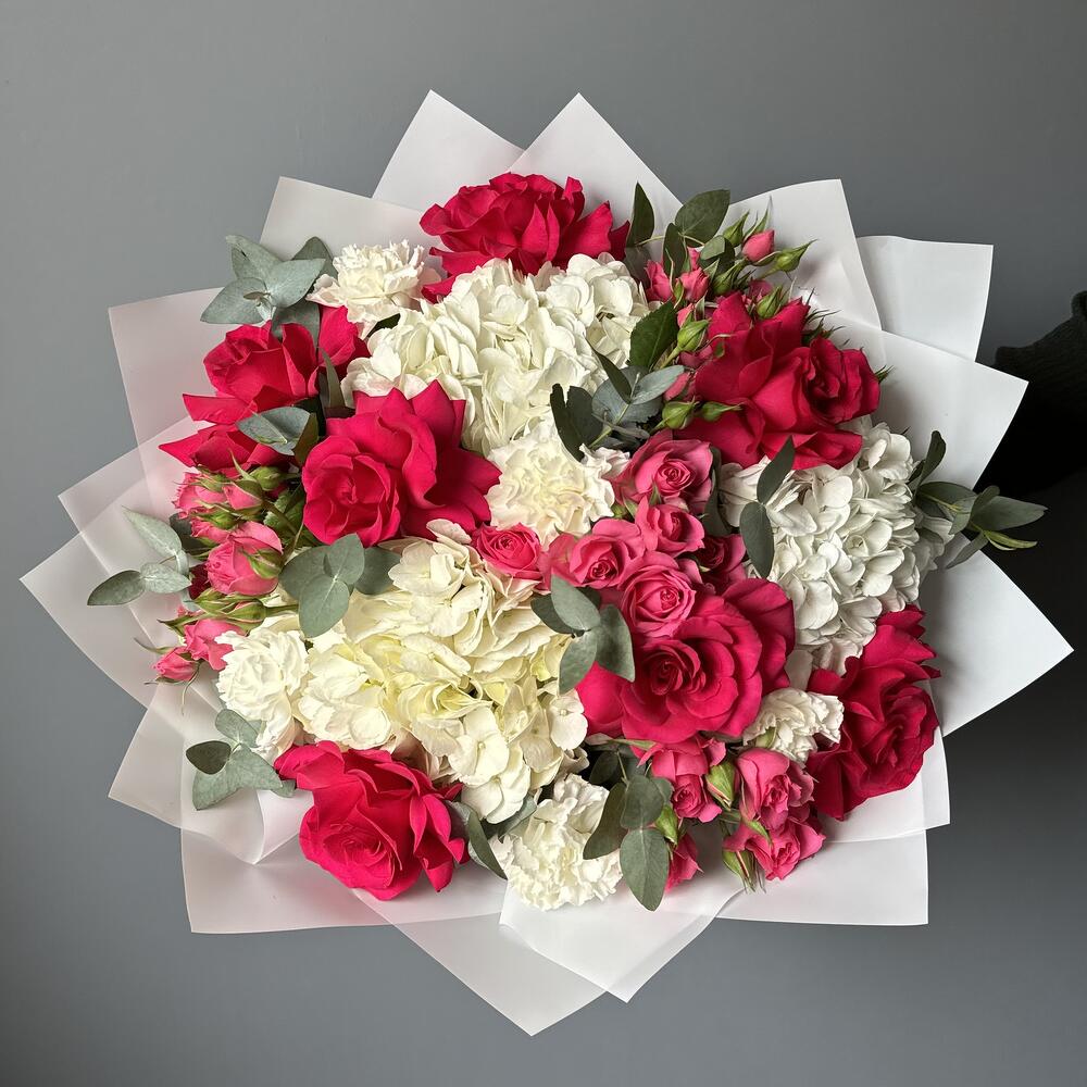 Încântați-vă simțurile cu acest buchet spectaculos, care combină eleganța hortensiei albe cu delicatețea trandafirilor ciclam. Perfect pentru a adăuga un strop de culoare și rafinament oricărei ocazii, acest aranjament floral este o alegere deosebită pentru nunți, aniversări sau pentru a surprinde persoanele dragi.