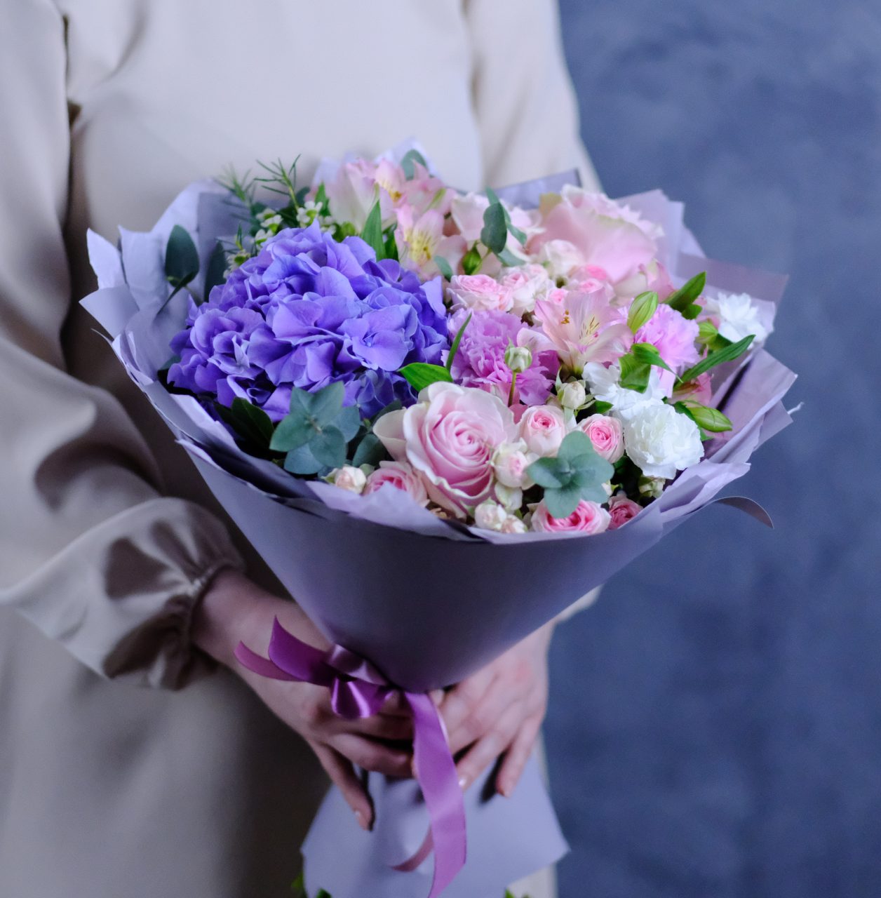 Încântați-vă simțurile cu buchetul nostru minunat, care combină frumusețea hortensiei albastre cu delicatețea florilor roz! Acest aranjament floral spectaculos este perfect pentru a celebra momentele speciale din viața dumneavoastră sau pentru a aduce un zâmbet pe chipul celor dragi.
