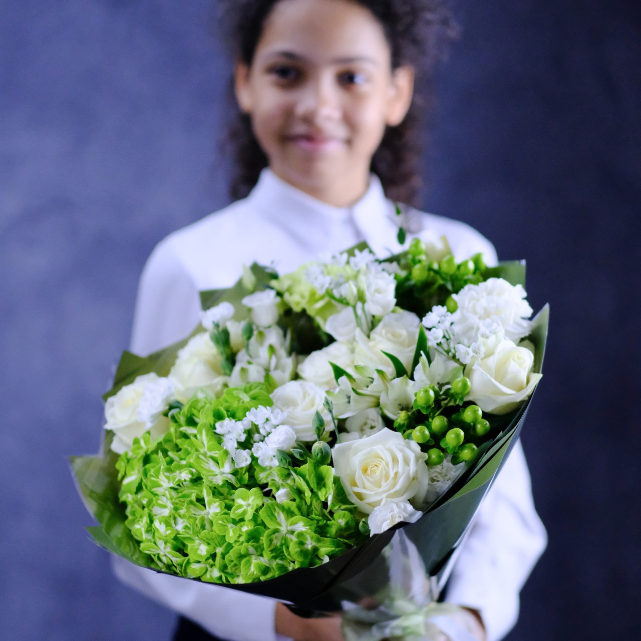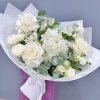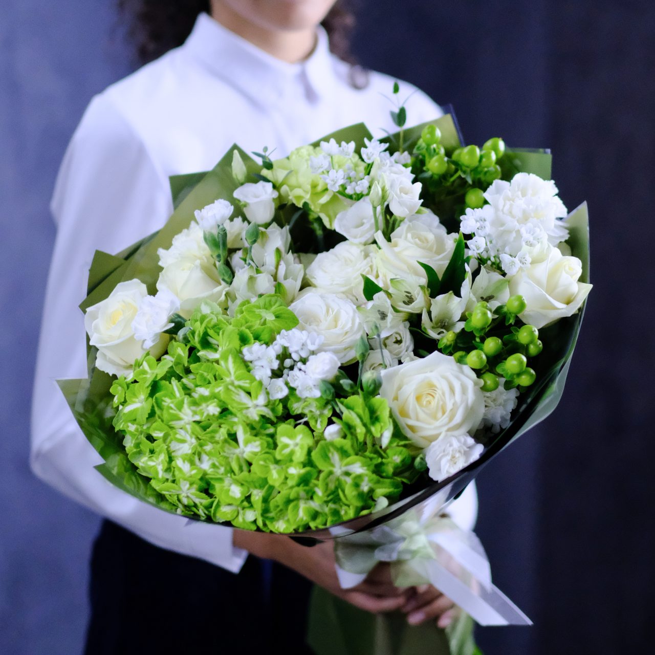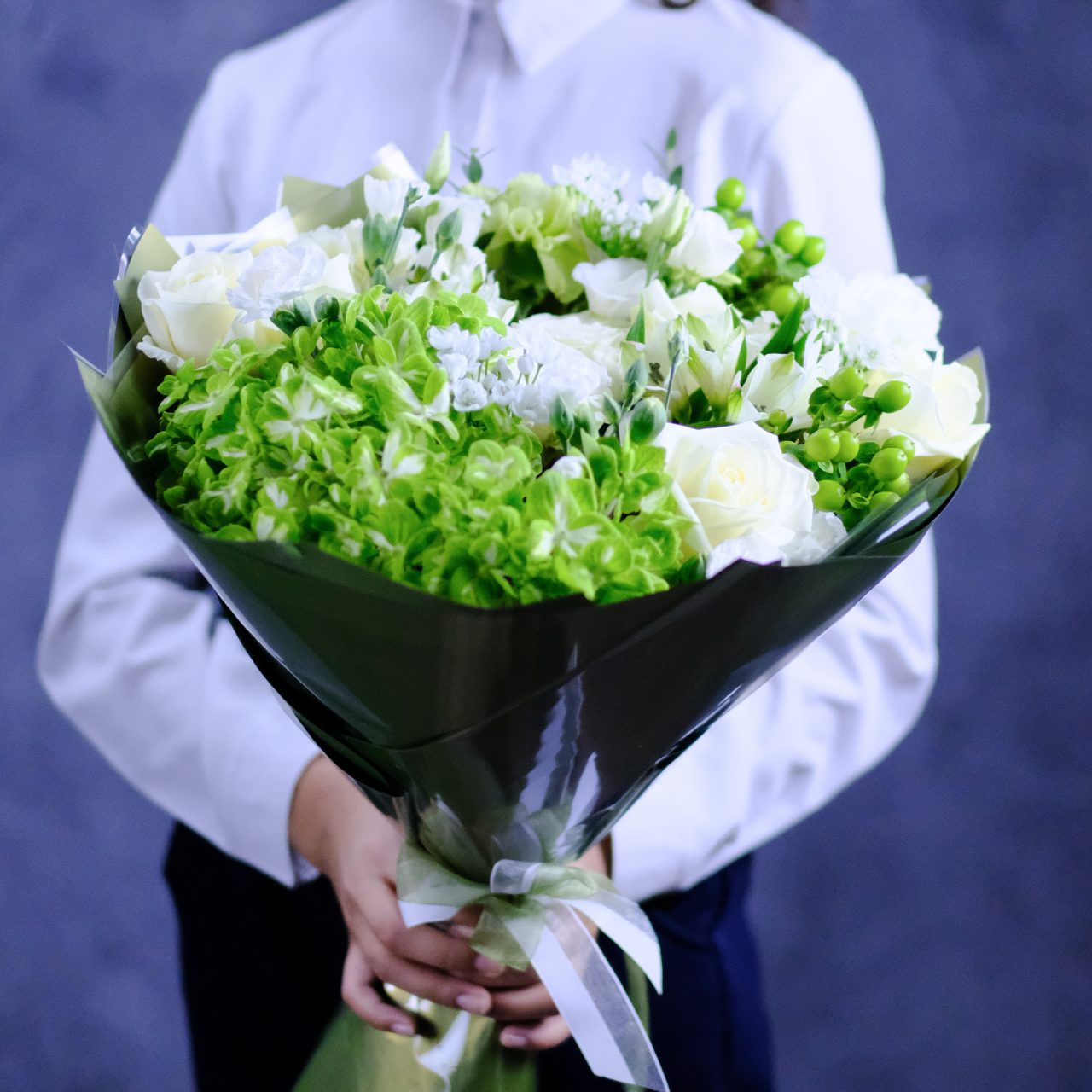Întregul aranjament este ambalat cu grijă într-un ambalaj sofisticat în nuanțe de verde, reflectând tema naturală și aducând un plus de stil. Această combinație perfectă de flori albe și hortensie verde îl face potrivit pentru diverse ocazii, de la nunți și aniversări până la evenimente corporative sau cadouri pentru cei dragi.