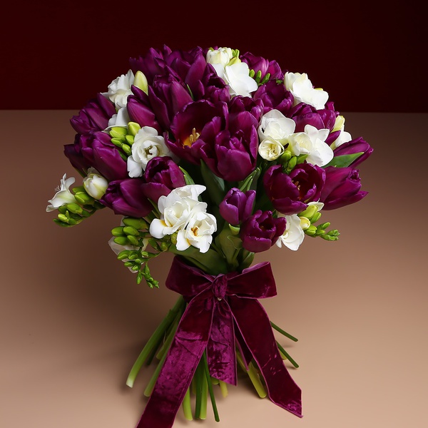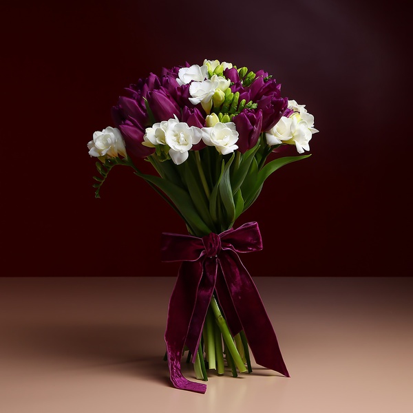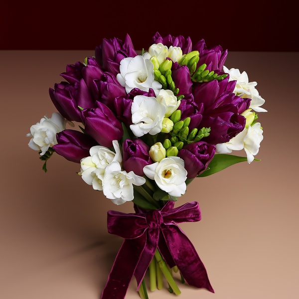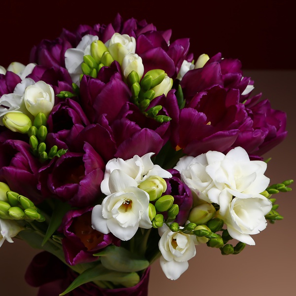 Buchet cu Lalele Mov si Frezii Albe 35 de fire