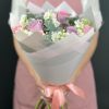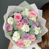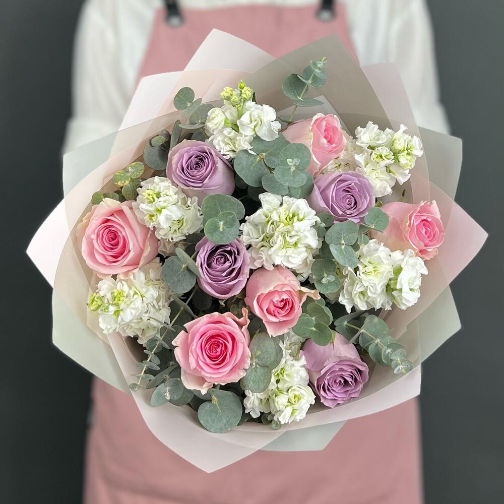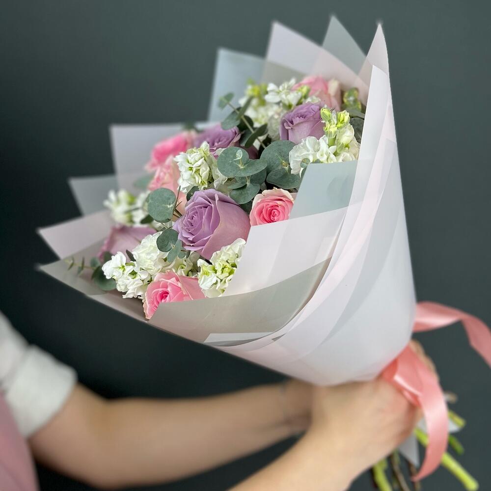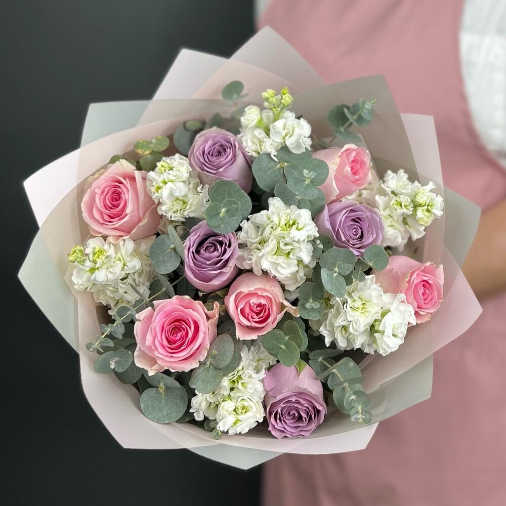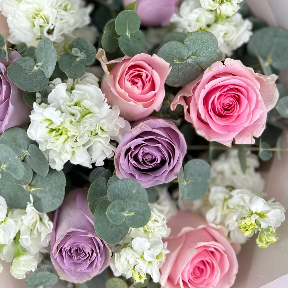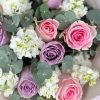 Buchet Cu Trandafiri Roz Si Mov Matthiola Alba – Descriere